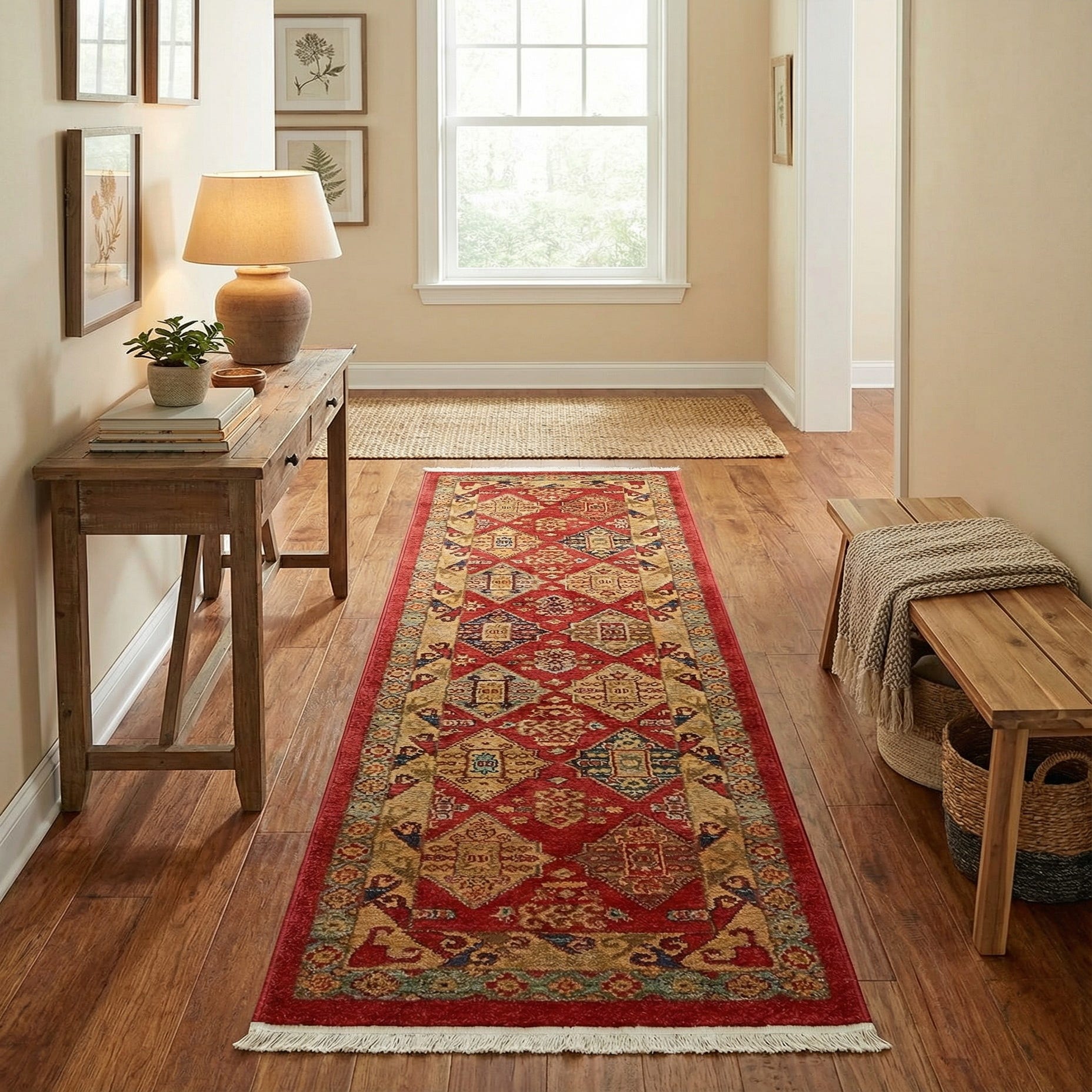 This runner works well in classic and transitional interiors—place it in a hallway or entry to add color and pattern, layer it along the side of a bed for a warm, structured look, or use it in a narrow kitchen or galley to bring a decorative thread through the space. Pair it with warm wood tones, navy upholstery, or muted green accents to complement the color palette, or let it bridge patterned textiles in an eclectic, global-inspired room.