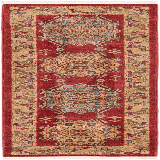 Primary color is Red. Colors in this rug include: Red, Beige, Blue, Light Blue, Ivory, Light Green.