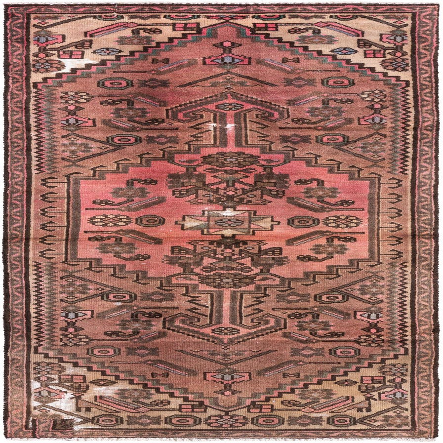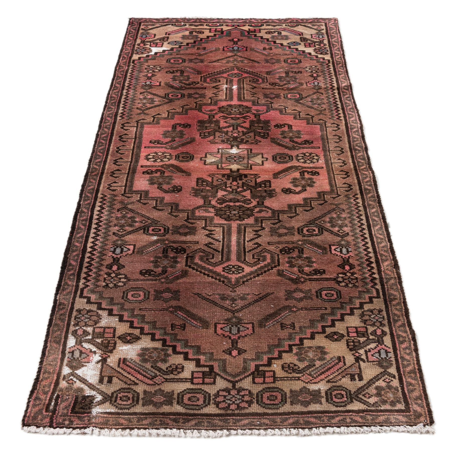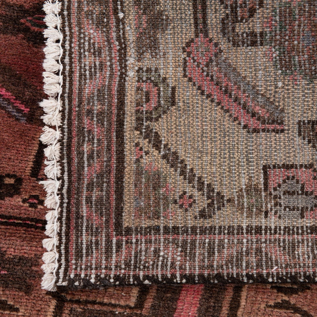 A 6 ft runner rug with a faded Persian pattern in shades of red, brown, and pink, featuring intricate geometric and floral motifs.