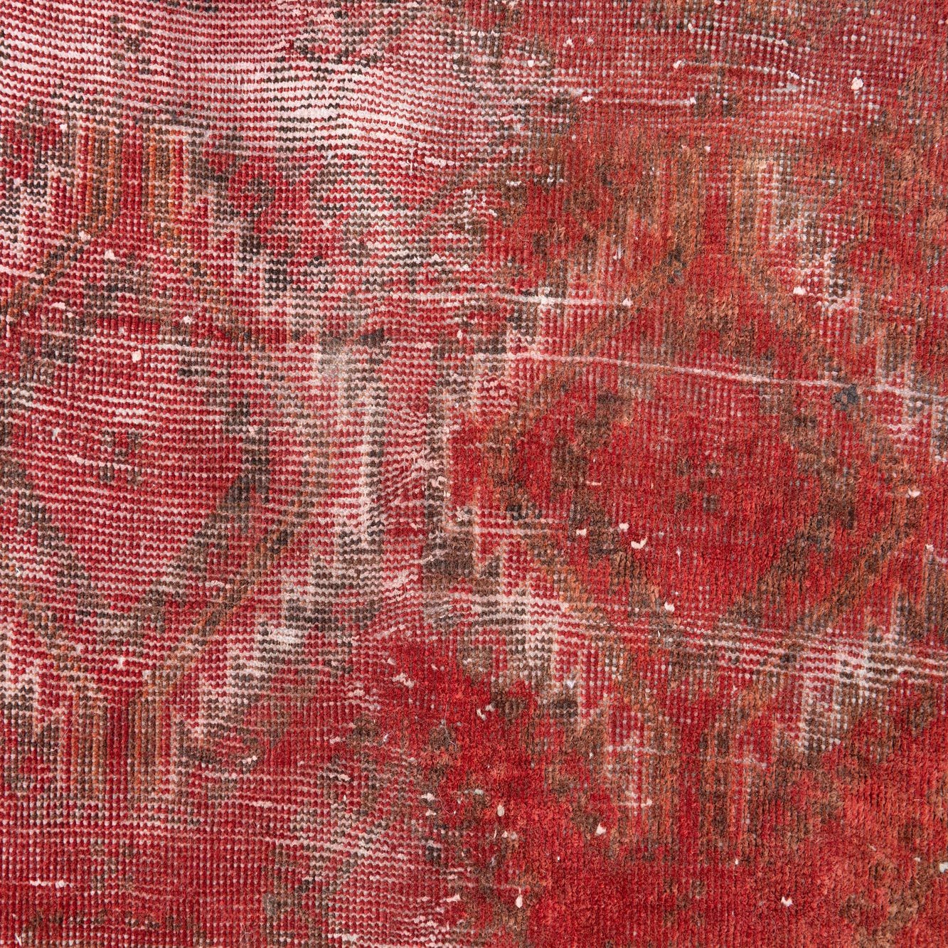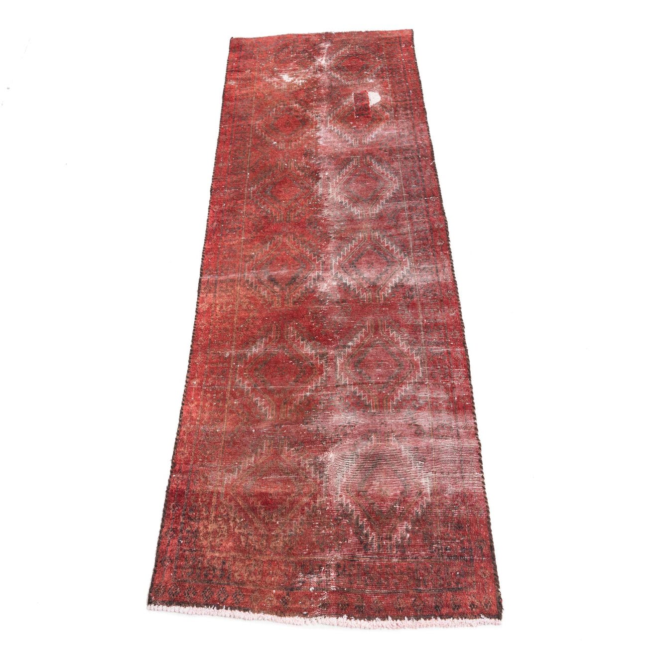 Hand-knotted from 100% wool, this runner presents a row of geometric diamond medallions set against a rich red field, with brown and navy blue accents that define the motifs and border. The surface carries a worn, vintage-washed finish with areas of deliberate fading and abrash that soften the pattern edges and reveal lighter tones beneath. The wool pile reads warm and dense underfoot, offering a tactile, slightly plush feel while retaining the flattened, lived-in look that gives the design character.