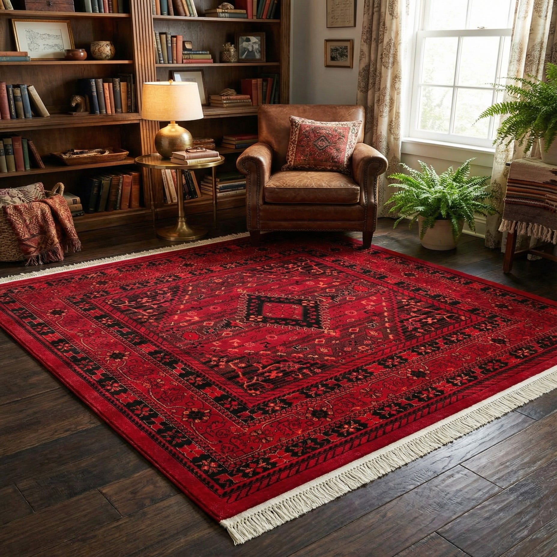 This piece works well as a grounding layer in a living room beneath a coffee table, as a focal pairing with leather or warm wood furniture, or to add depth in an entry or dining area. It complements traditional and transitional interiors as well as globally inspired schemes — pair it with cream linens, brass or dark metal accents, and terracotta or deep wood tones to bring out the rug’s warm palette and structured design.