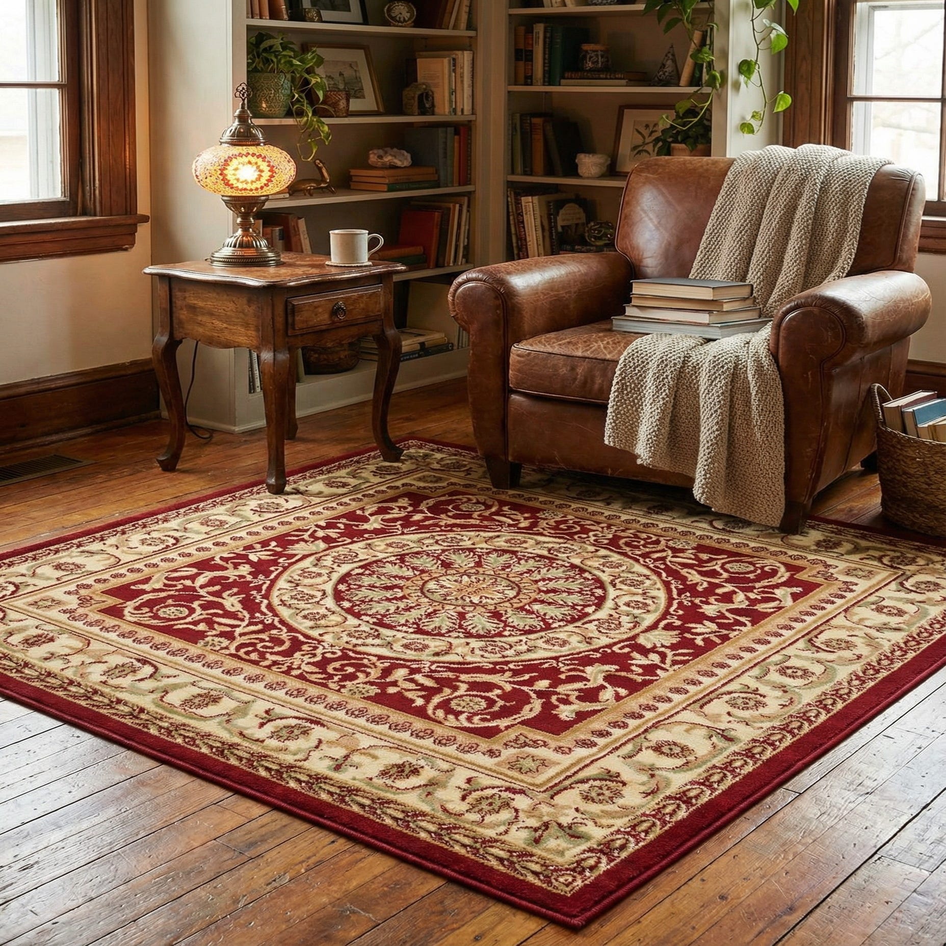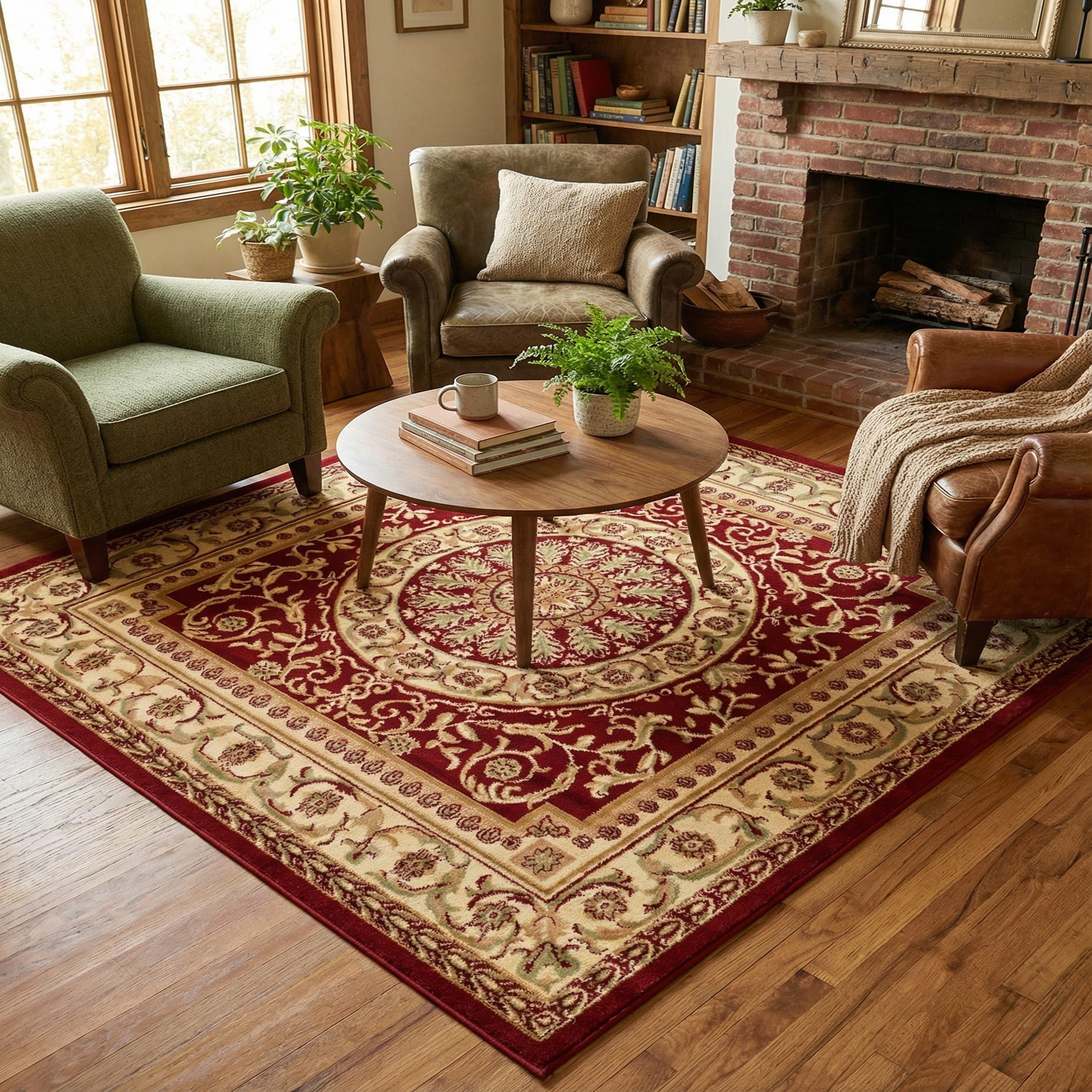 This rug pairs well with warm wood furniture and neutral upholstery, where the red field can serve as an anchoring focal point in a living room or under a round dining table. It also complements leather seating and brass or antique-gold accents, and adds a structured, traditional layer in entryways, libraries, or formal sitting areas. Use cream or tan textiles to harmonize with the borders, or introduce light-blue and green accessories to echo the design’s finer hues.
