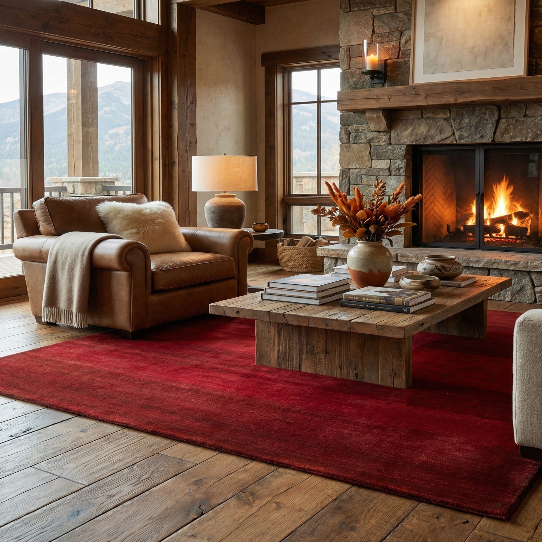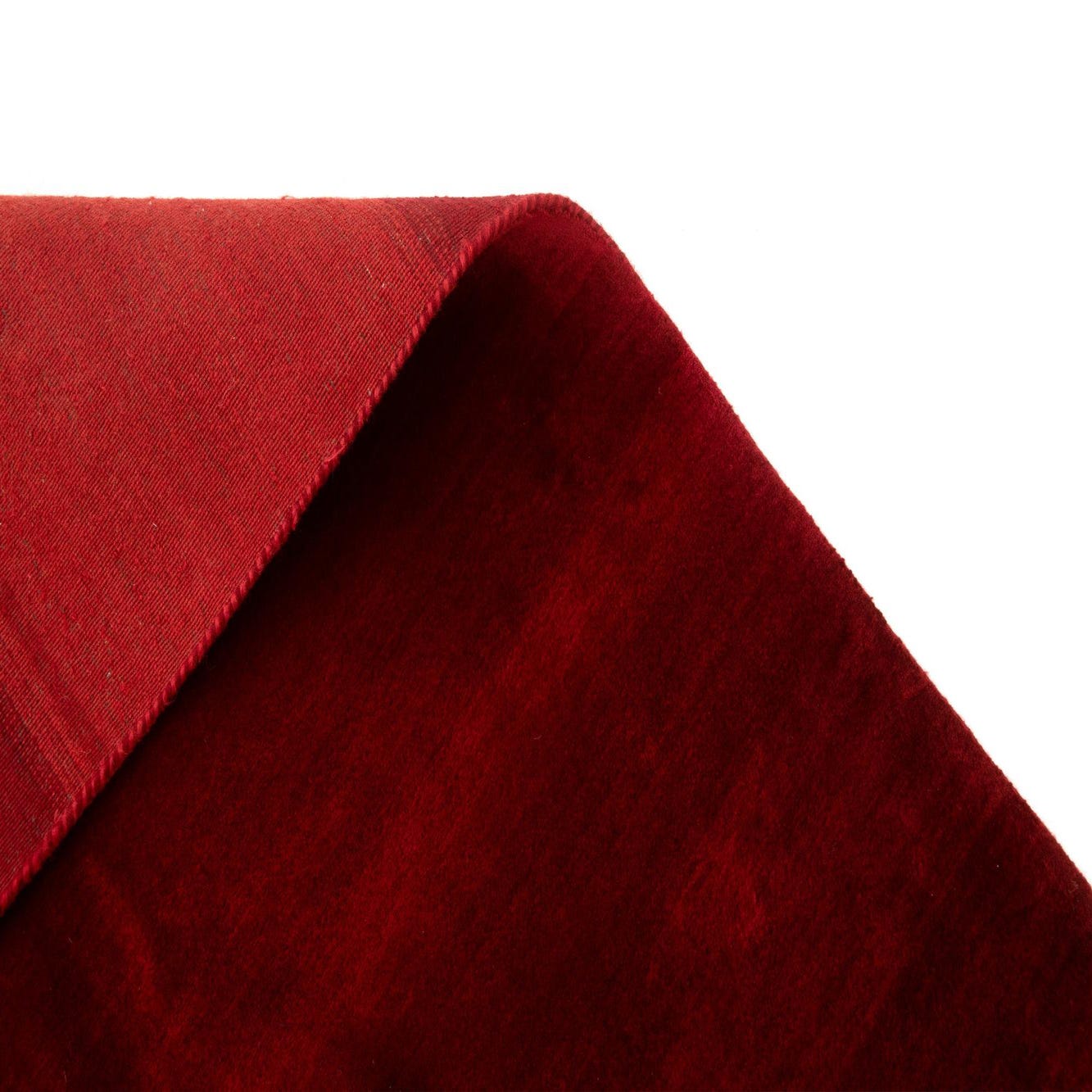 A 6' 6 x 6' 7 square modern Gabbeh rug featuring horizontal stripes in varying shades of red.