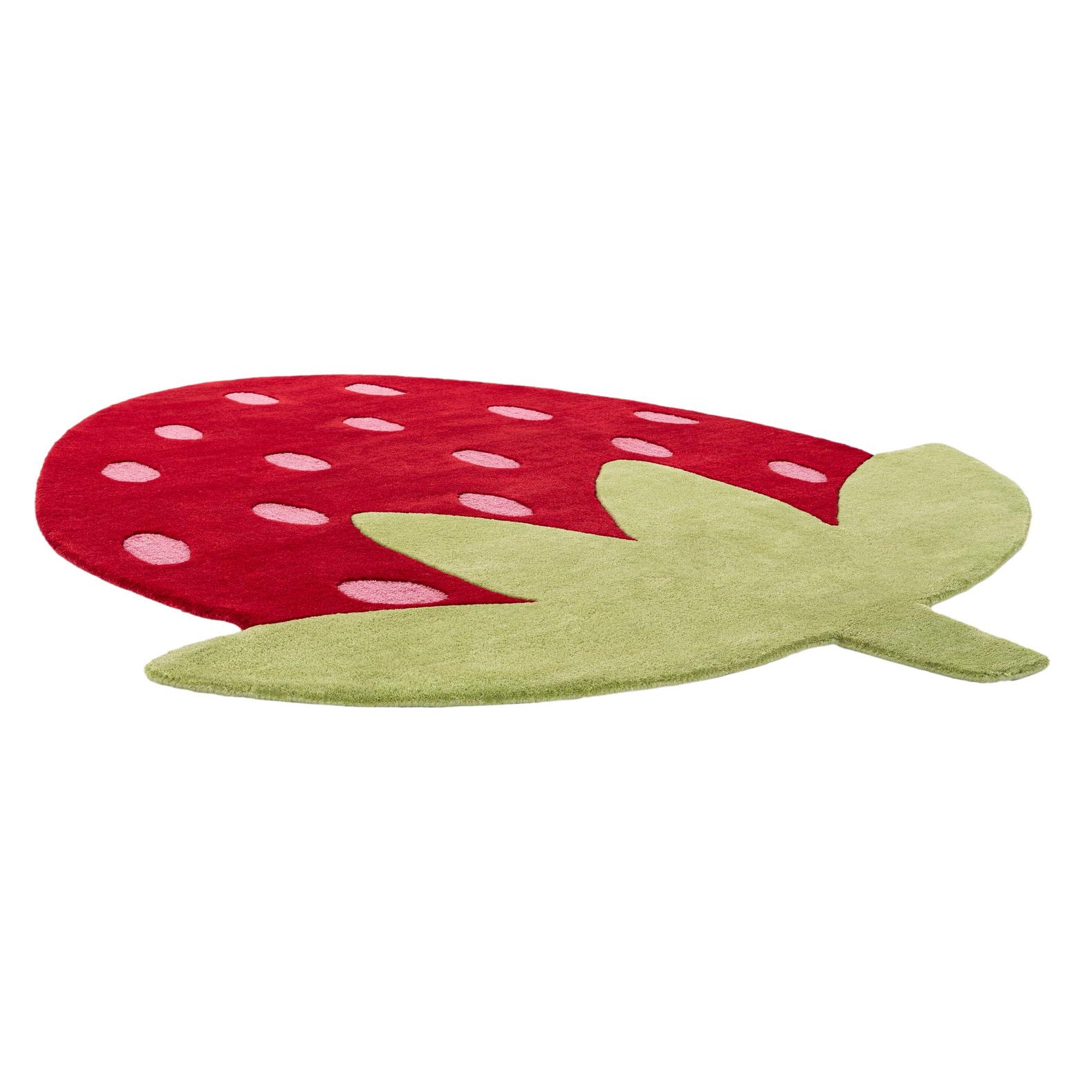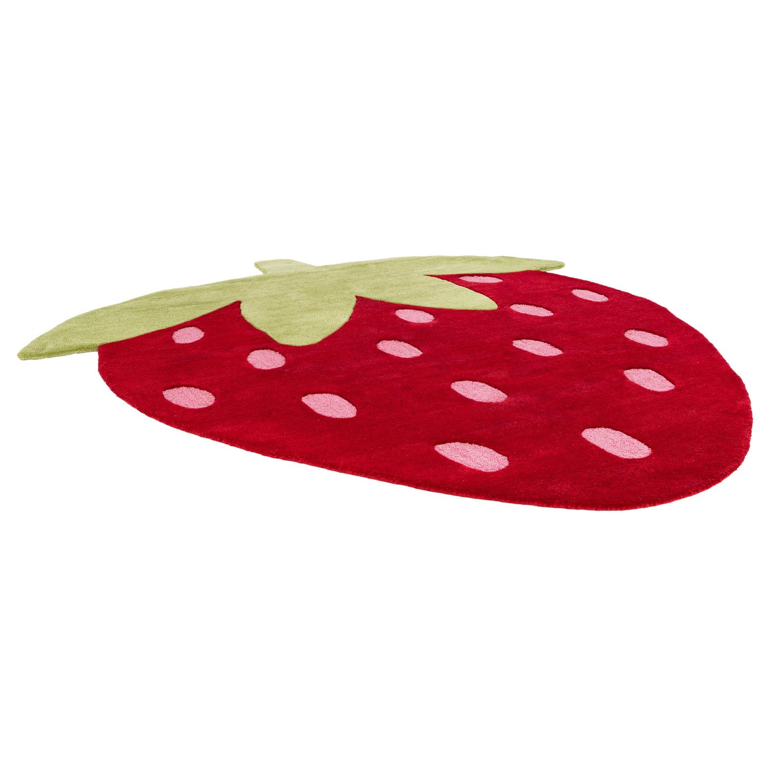 A vibrant red strawberry-shaped rug with light pink 'seeds' and a green stem, made of high-pile wool.