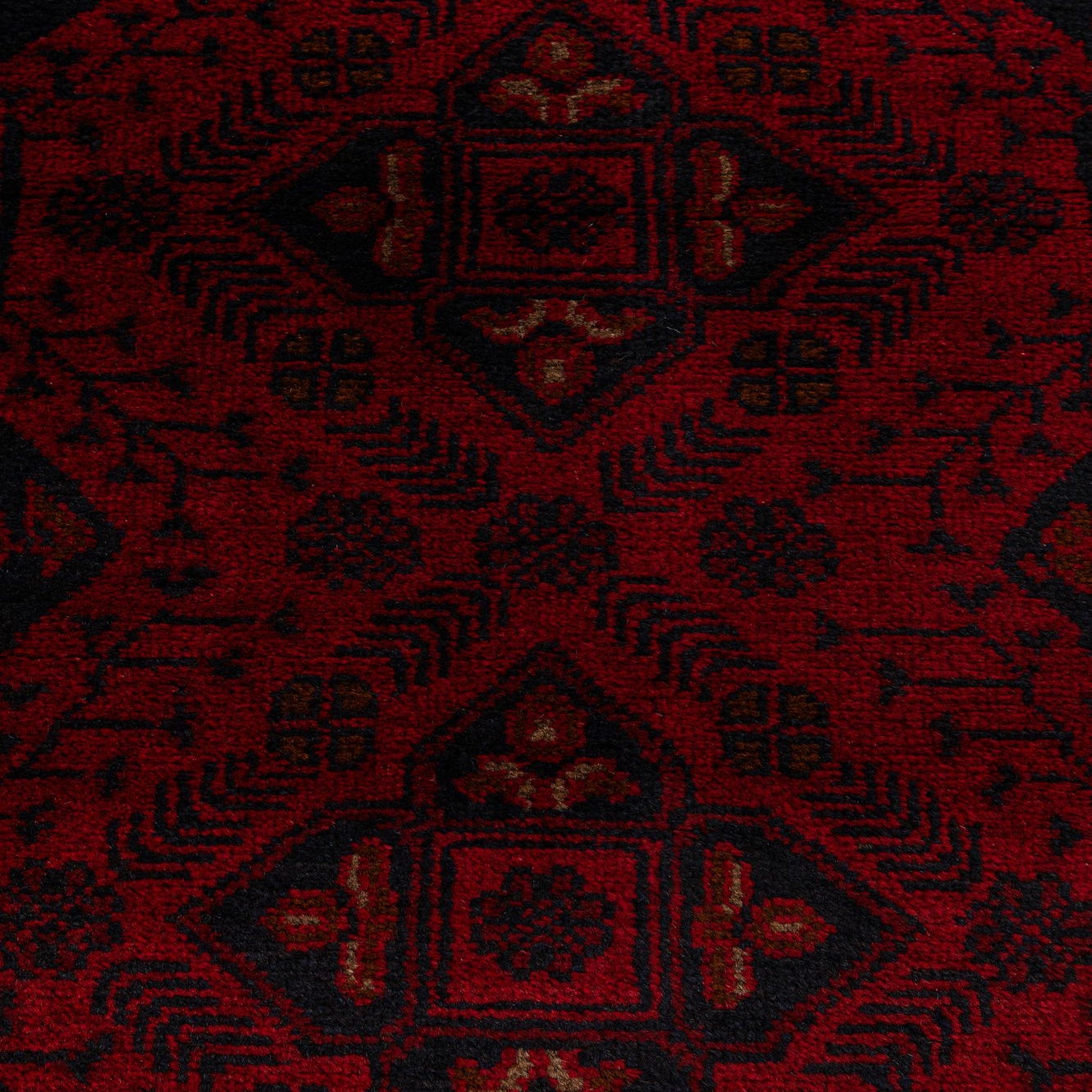 A 2' 7 x 6' 6 square Khal Mohammadi rug featuring a deep red field with intricate dark blue and black oriental patterns.