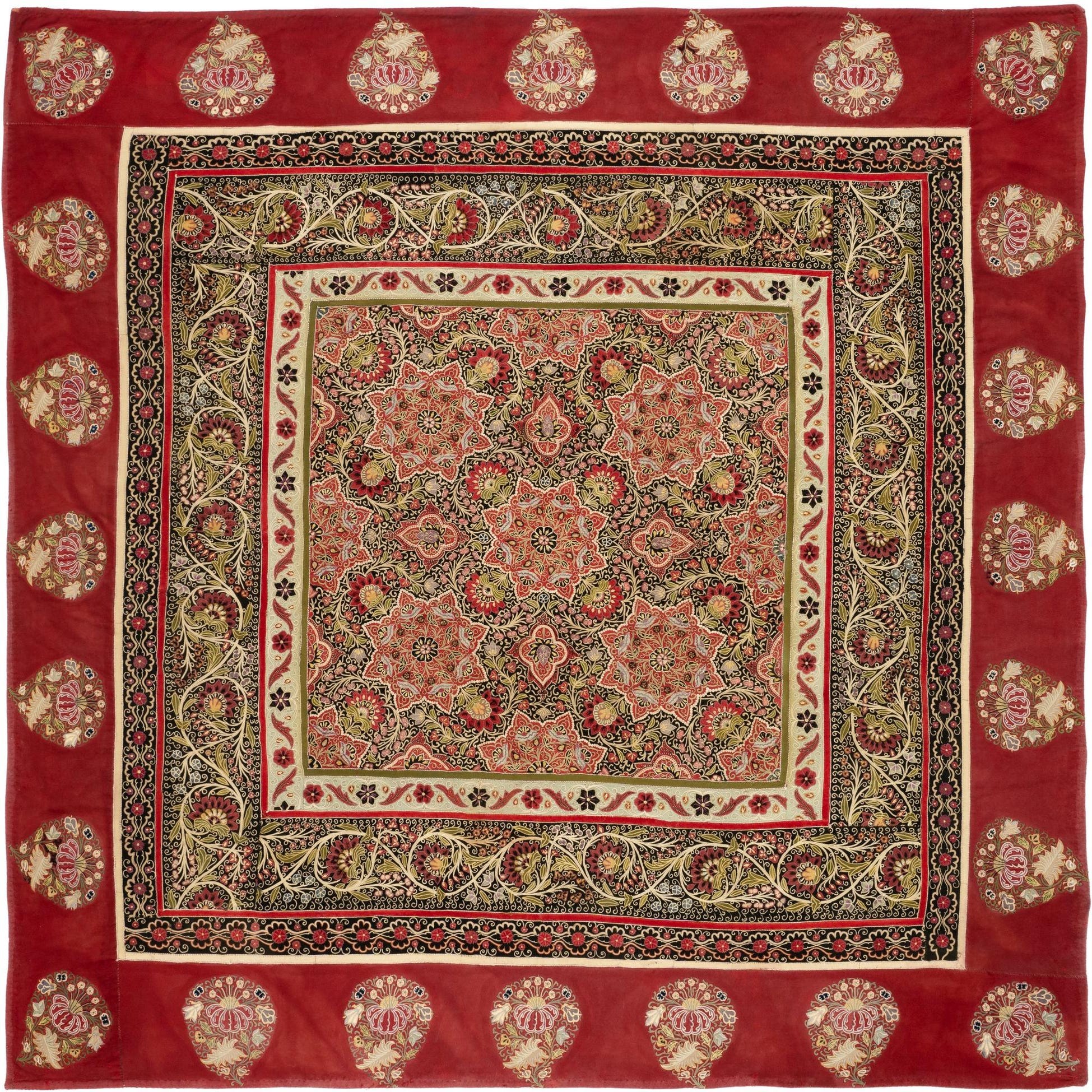A square 6' 2 x 6' 3 red Persian rug with intricate floral and medallion patterns in black, gold, and green.