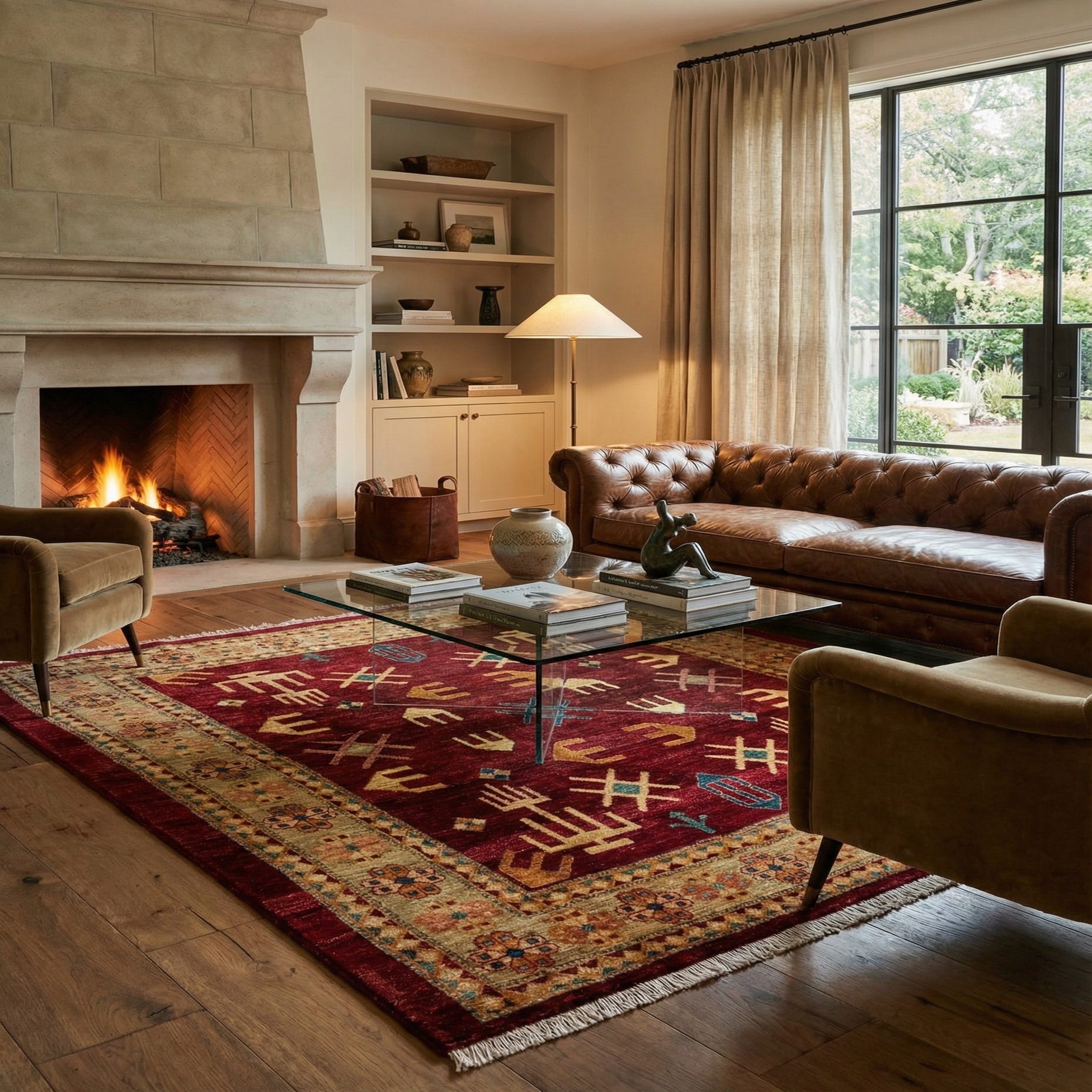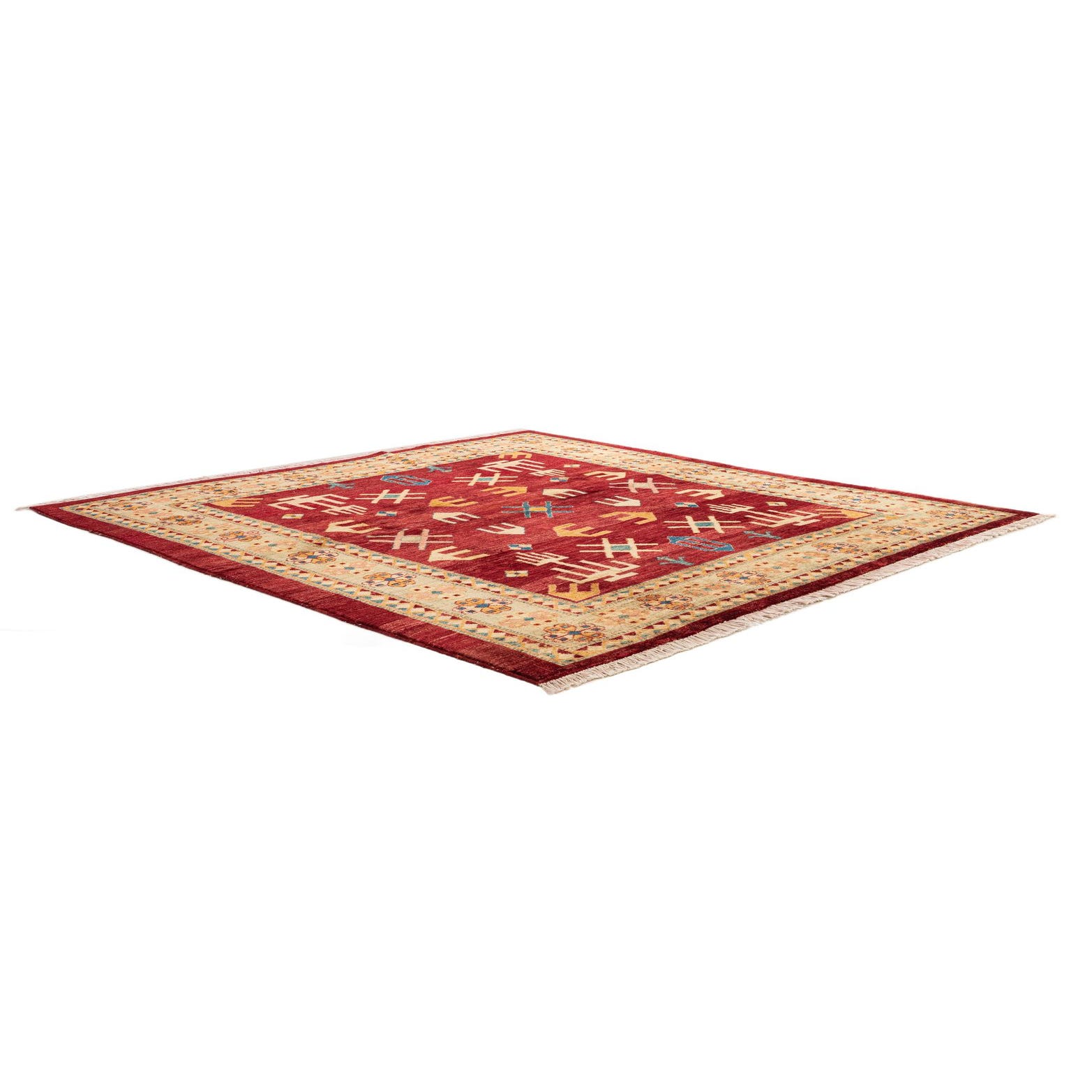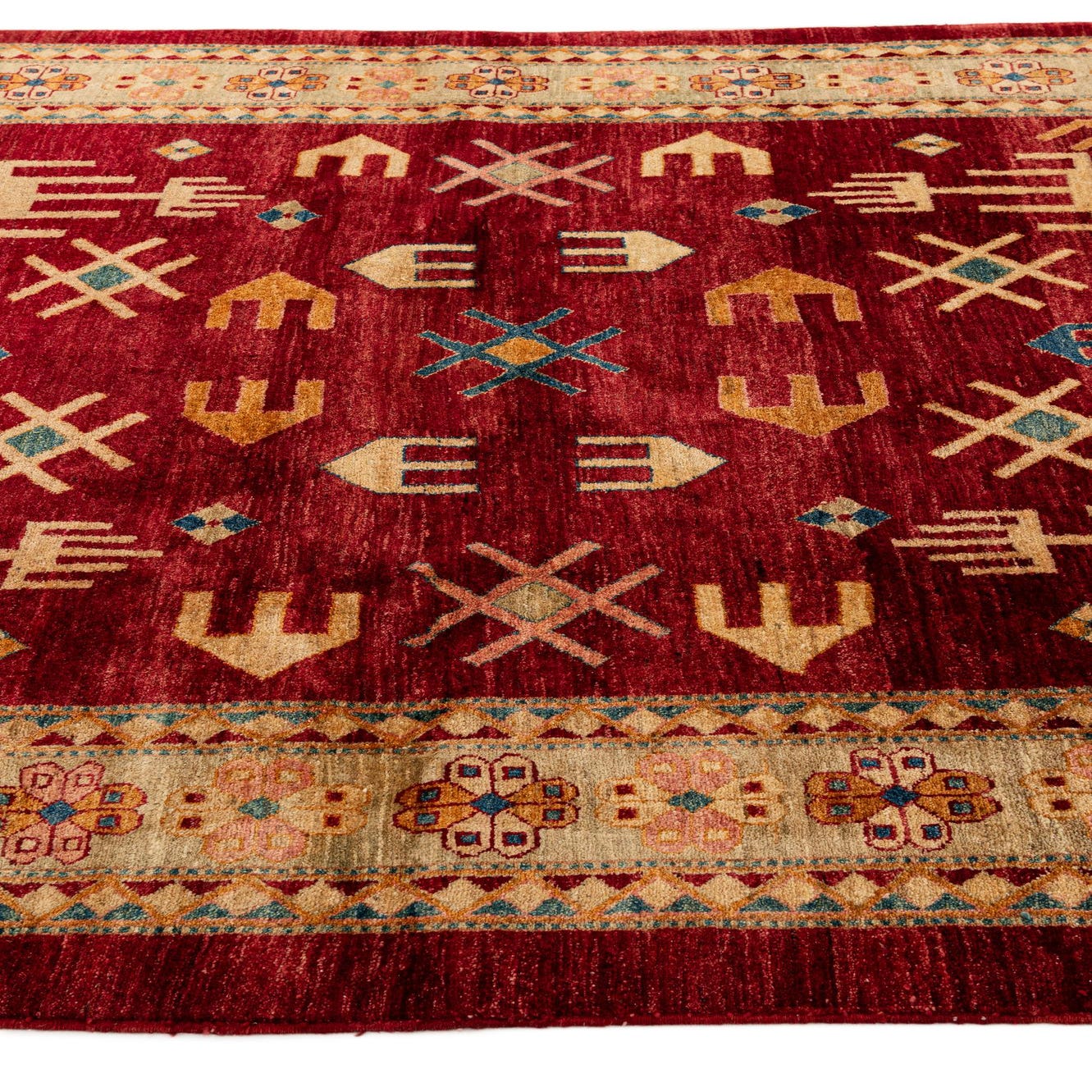 A deep red field anchors a pattern of geometric, tribal-inspired motifs in ivory, navy blue, peach, green and yellow. An ivory-toned border decorated with stylized floral rosettes and a stepped guard pattern frames the center, while small navy and green diamonds and peach accents add lively contrast. This rug works well as an anchor in a cozy living room seating area, beneath a square dining table, or as a focal point in a study or reading nook. Pair it with warm wood tones, neutral upholstery, and brass or matte-black accents, or bring out the navy and green with cushions and accessories for a cohesive, layered interior.