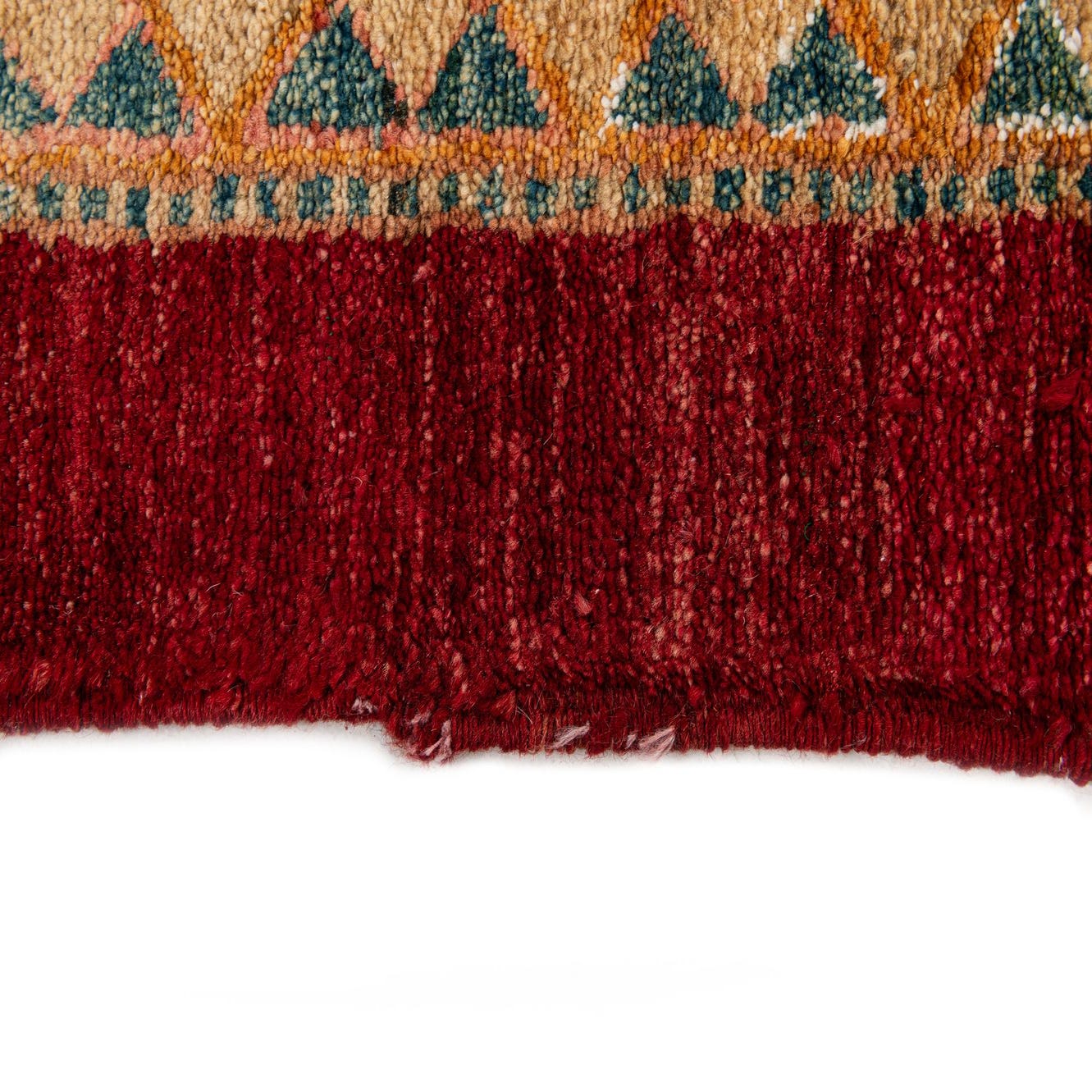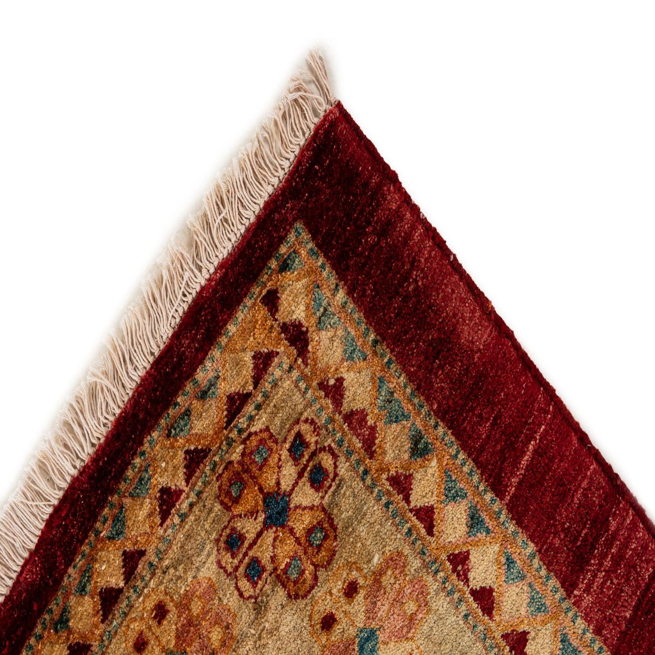 Hand-knotted of 100% wool, this rug has a dense, plush pile that feels softly springy underfoot. The hand-knotting creates subtle variations in texture and tone across the surface, and short fringe finishes the ends for a traditional look. The wool pile gives the colors a warm, slightly muted luster that changes gently with light and movement.
