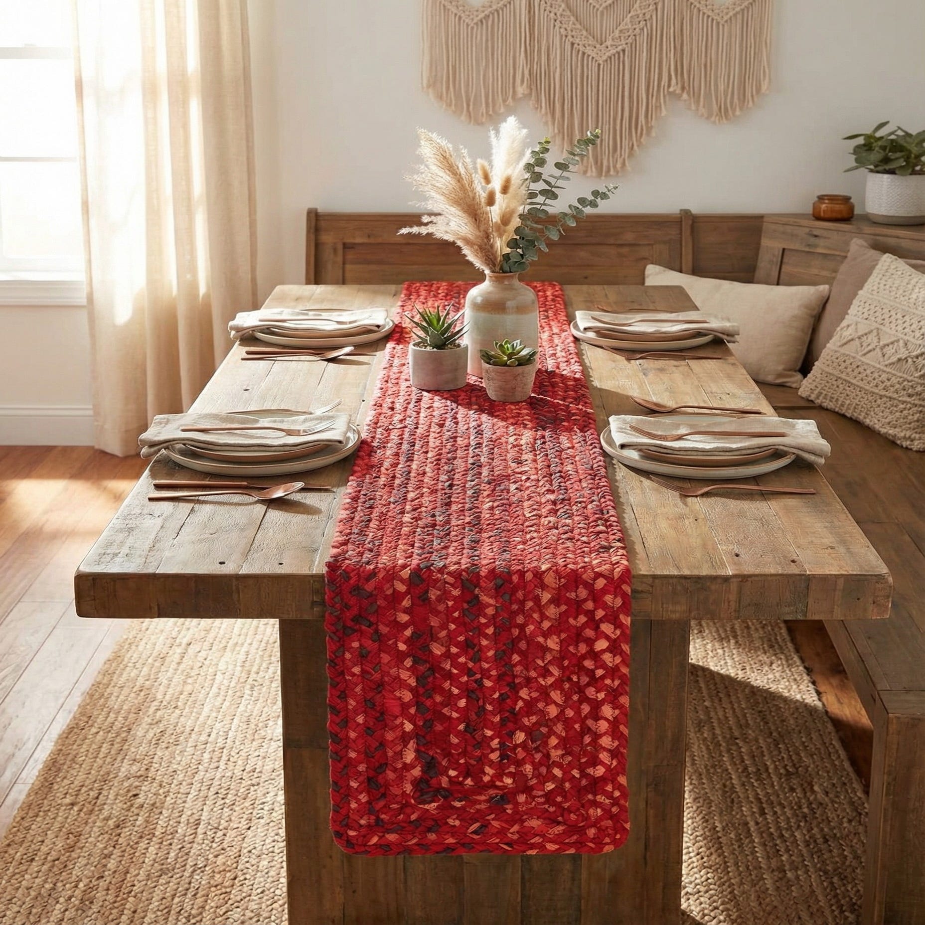 A 1' 2 x 6' 1 red braided chindi runner rug, handmade from recycled cotton, featuring varied shades of red and subtle darker tones.