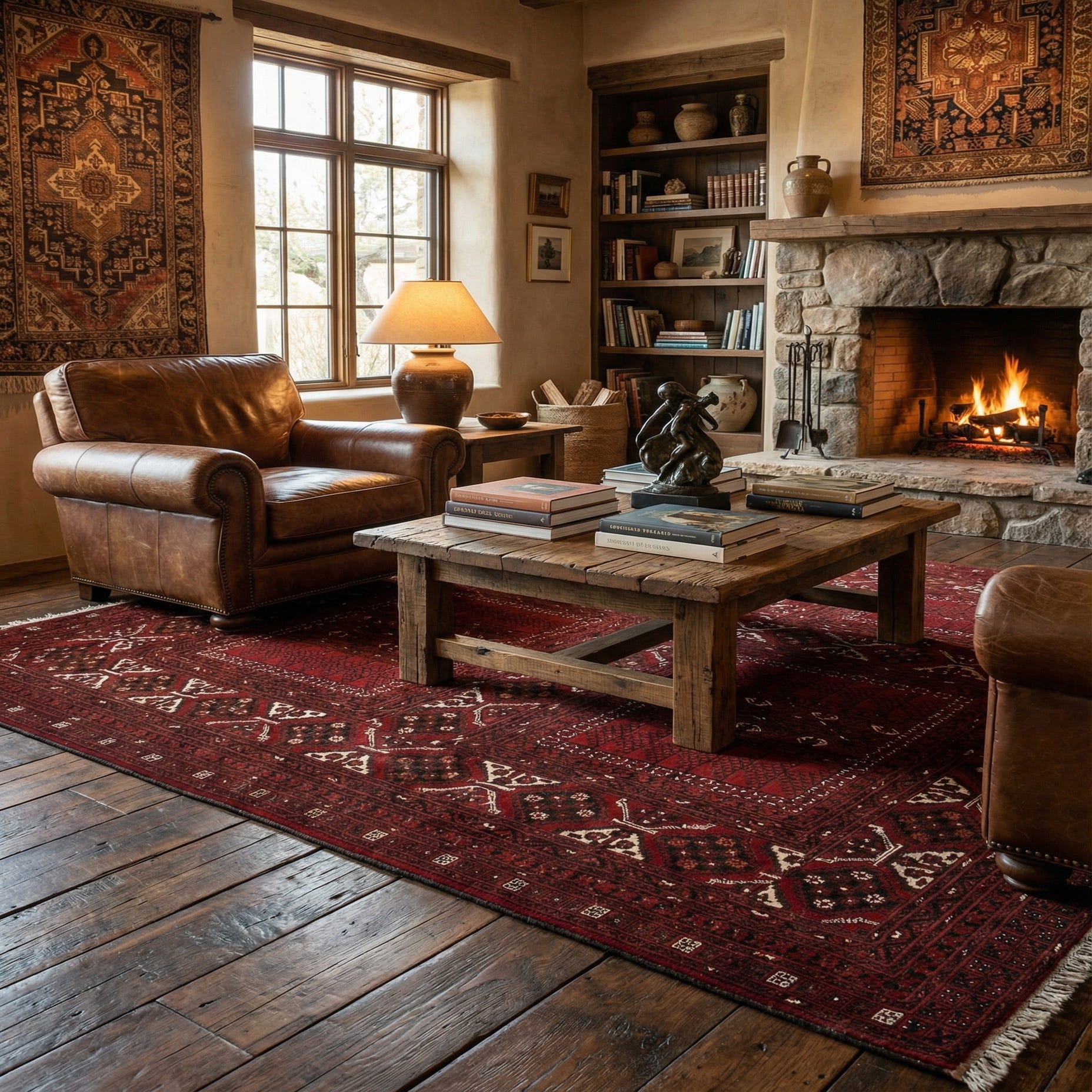 A 6x9 rectangular Afghan Ersari rug featuring a deep red field with intricate tribal and traditional patterns in black, cream, and subtle orange, handmade from wool.