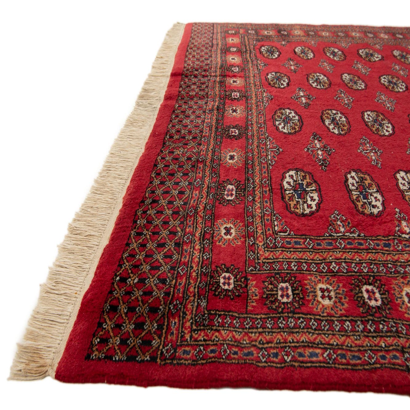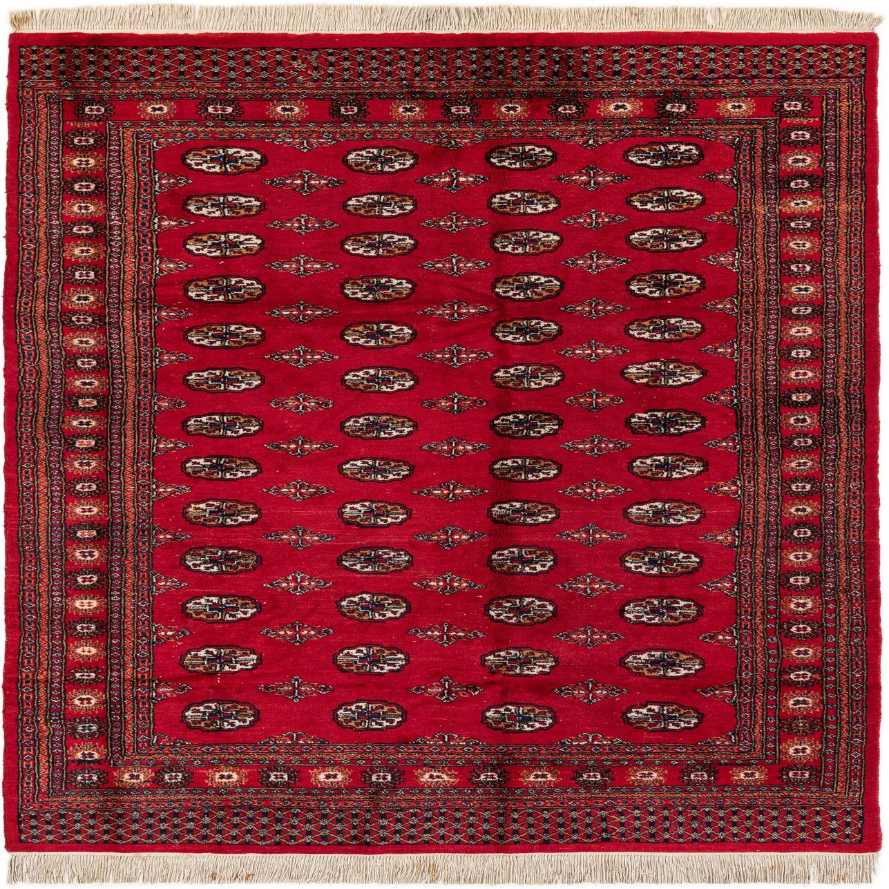 A 6x9 rectangular Afghan Ersari rug featuring a traditional tribal pattern with repeating medallions in shades of red, black, and cream, set on a vibrant red field with a detailed border and fringe.