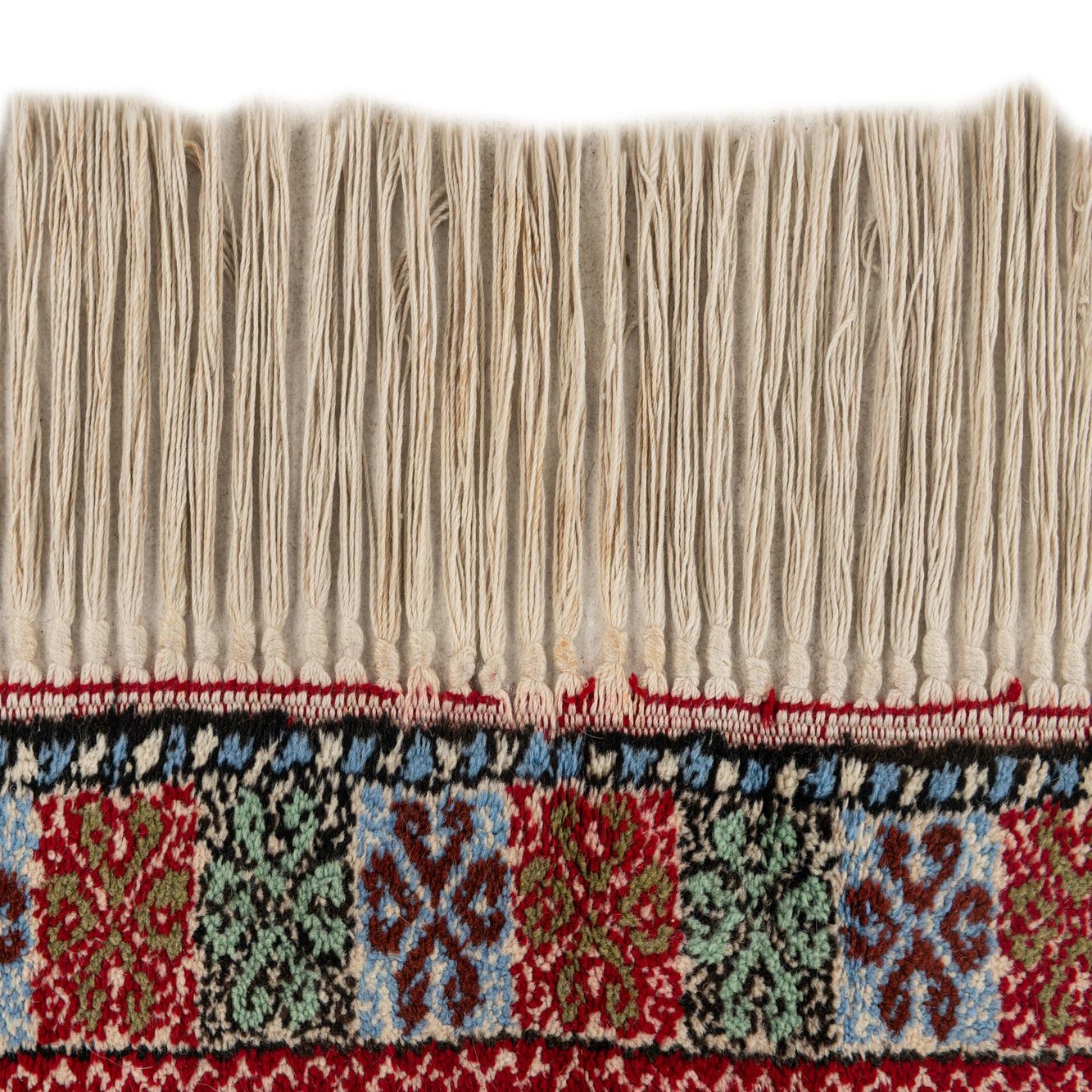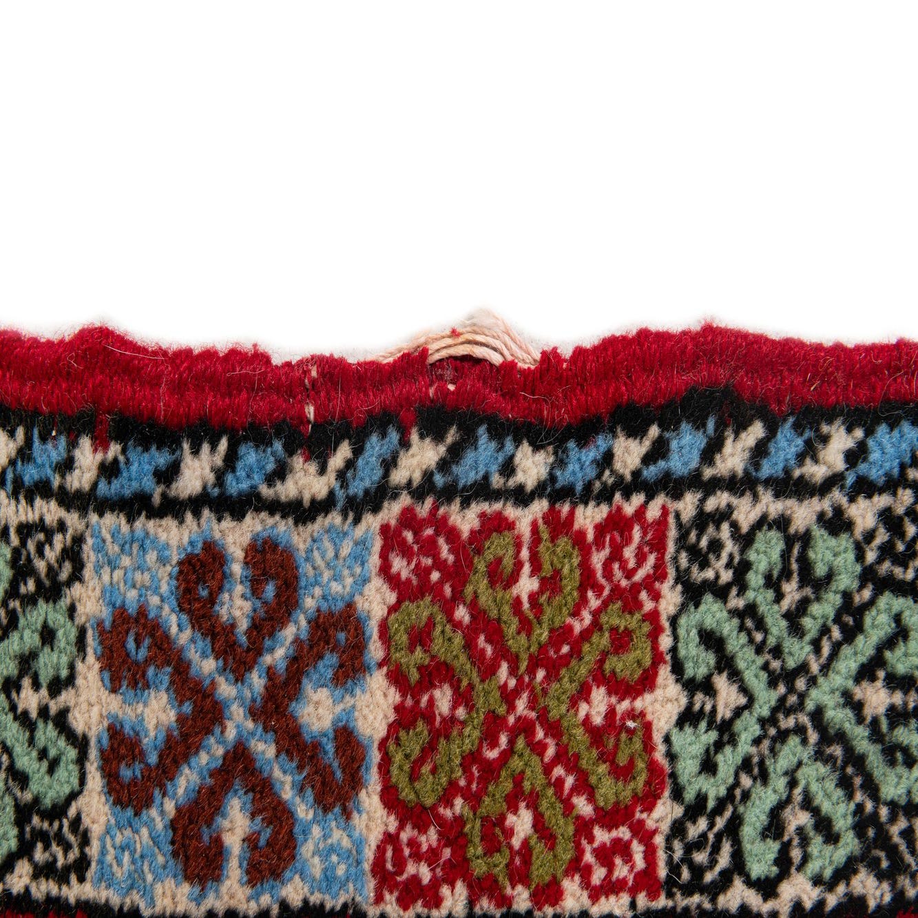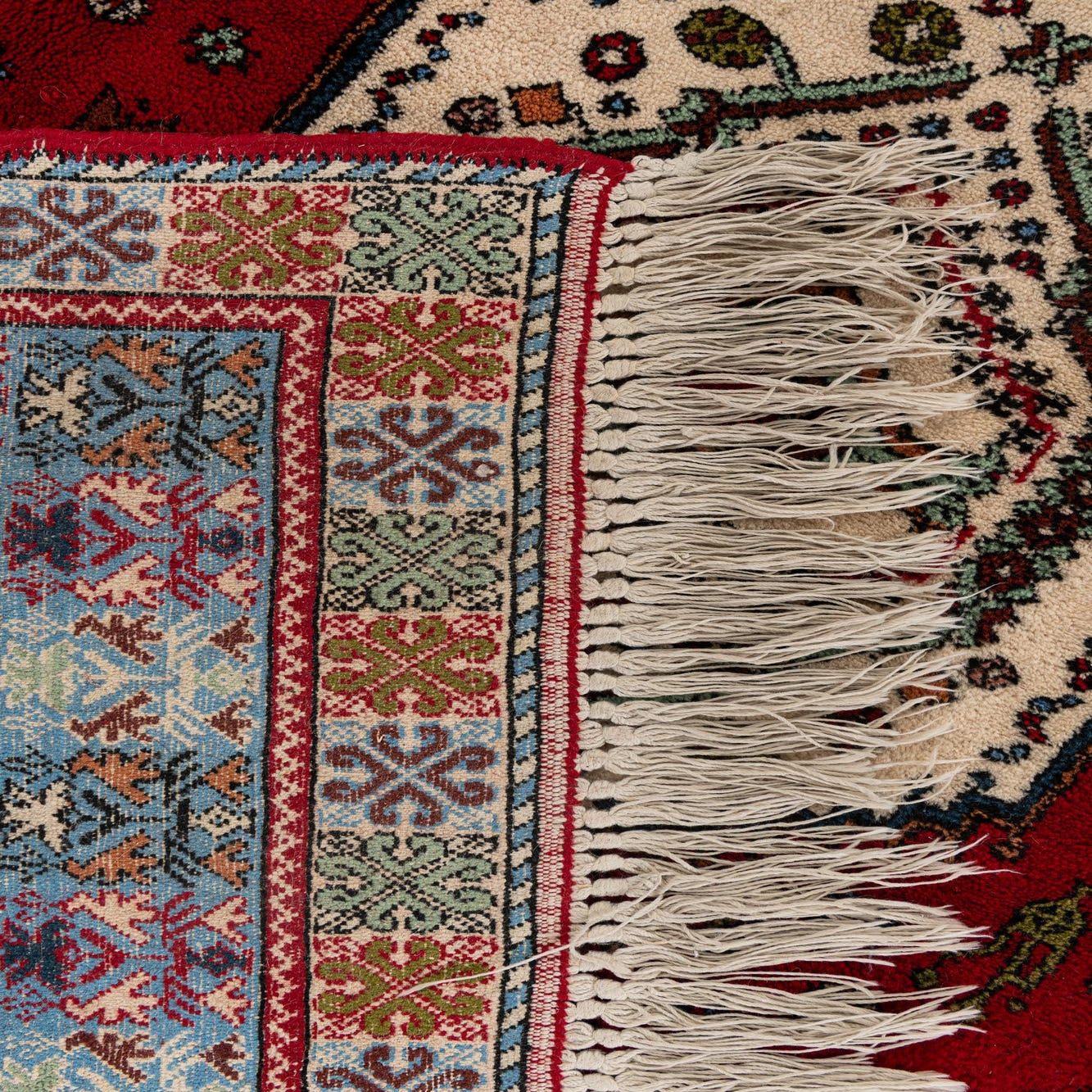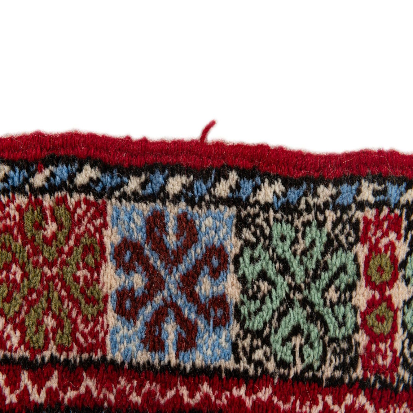 Primary color is Red. Colors in this rug include: Red, Black, Ivory, Light Blue, Green, Brown.