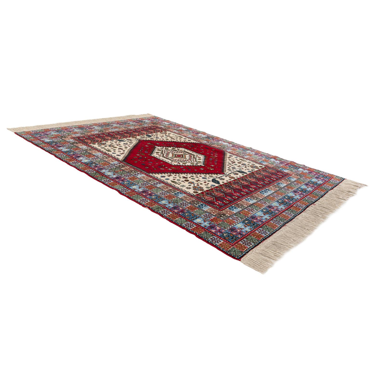 A 6x9 rectangular Anatolian wool rug featuring a large red medallion on a cream field, surrounded by intricate traditional patterns and borders in red, blue, green, and gold.