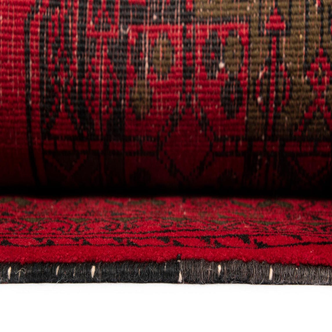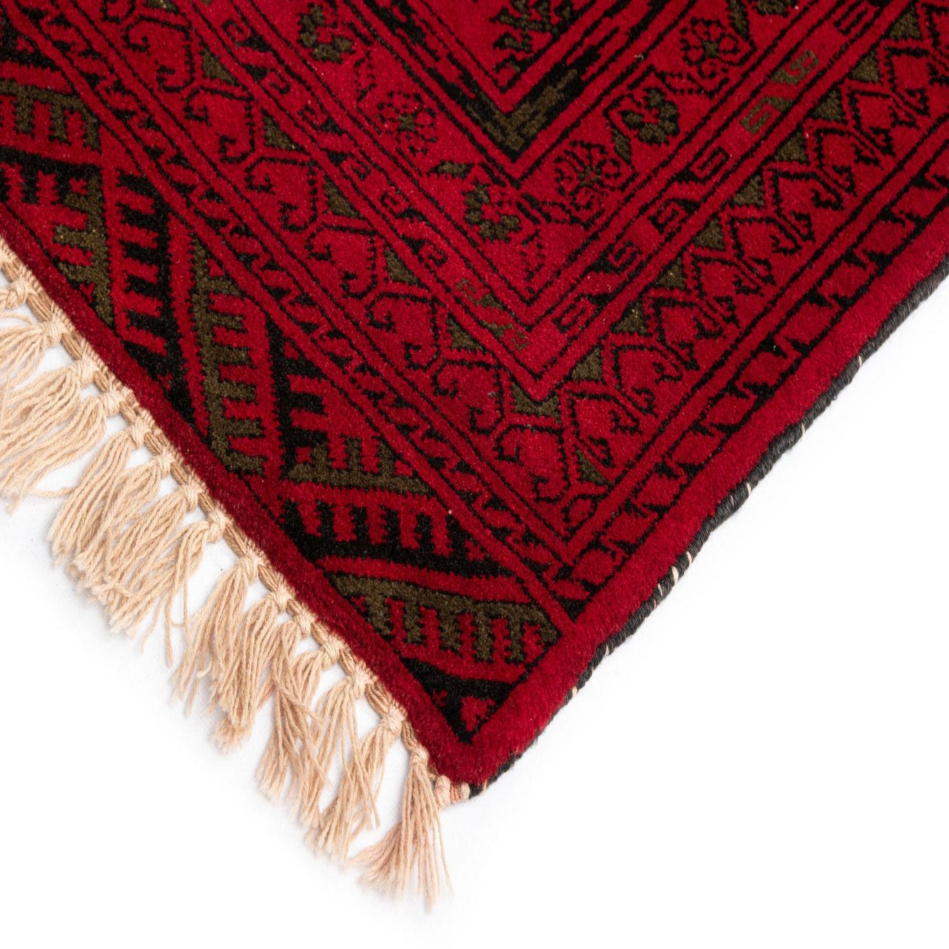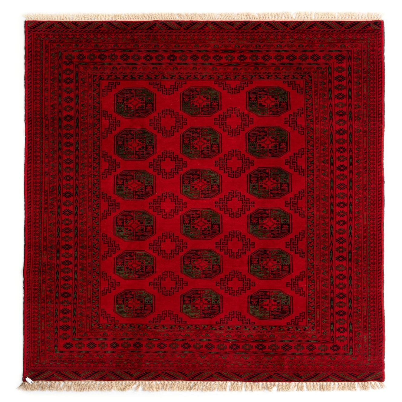 Primary color is Red. Colors in this rug include: Red, Red, Green, Black.