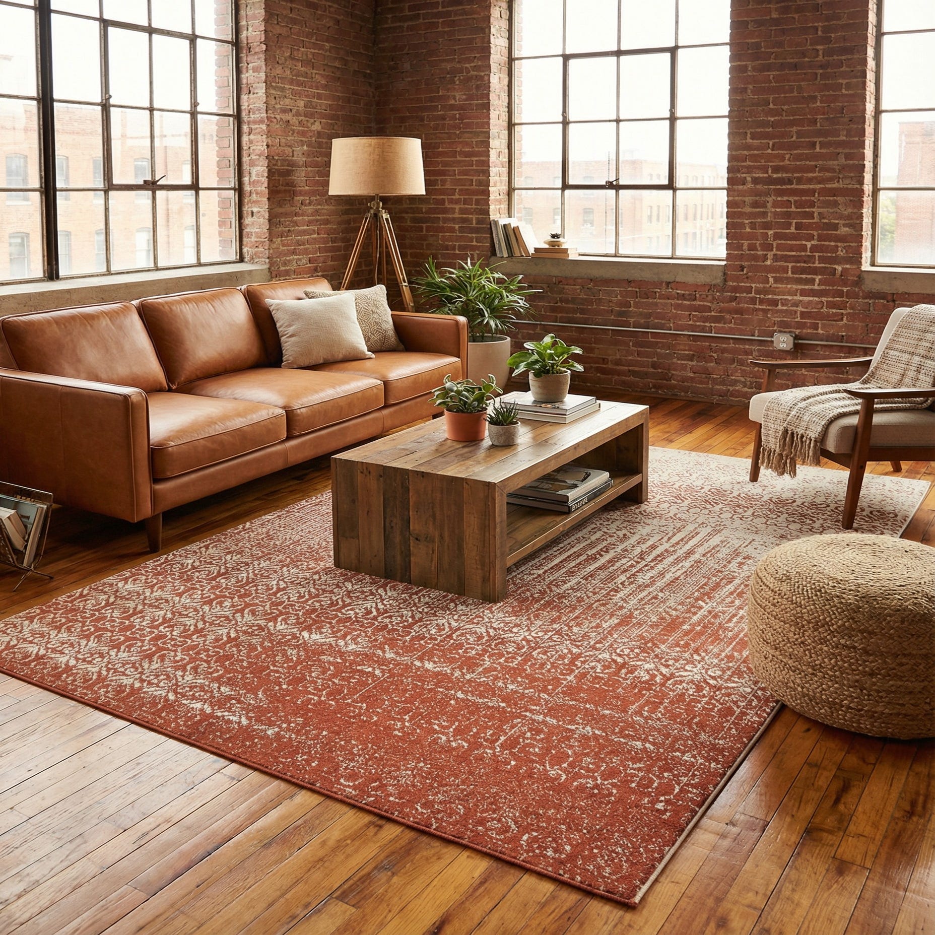 Warm woods, leather seating and natural linens bring out the terracotta and light-brown tones, while neutral walls or deep navy accents provide contrast to the red field. Use this rug to anchor a living-room seating group with a coffee table and the front legs of sofas on the rug, place it beneath a dining table to add color and pattern, or layer it at the foot of a bed to introduce warmth and visual interest.