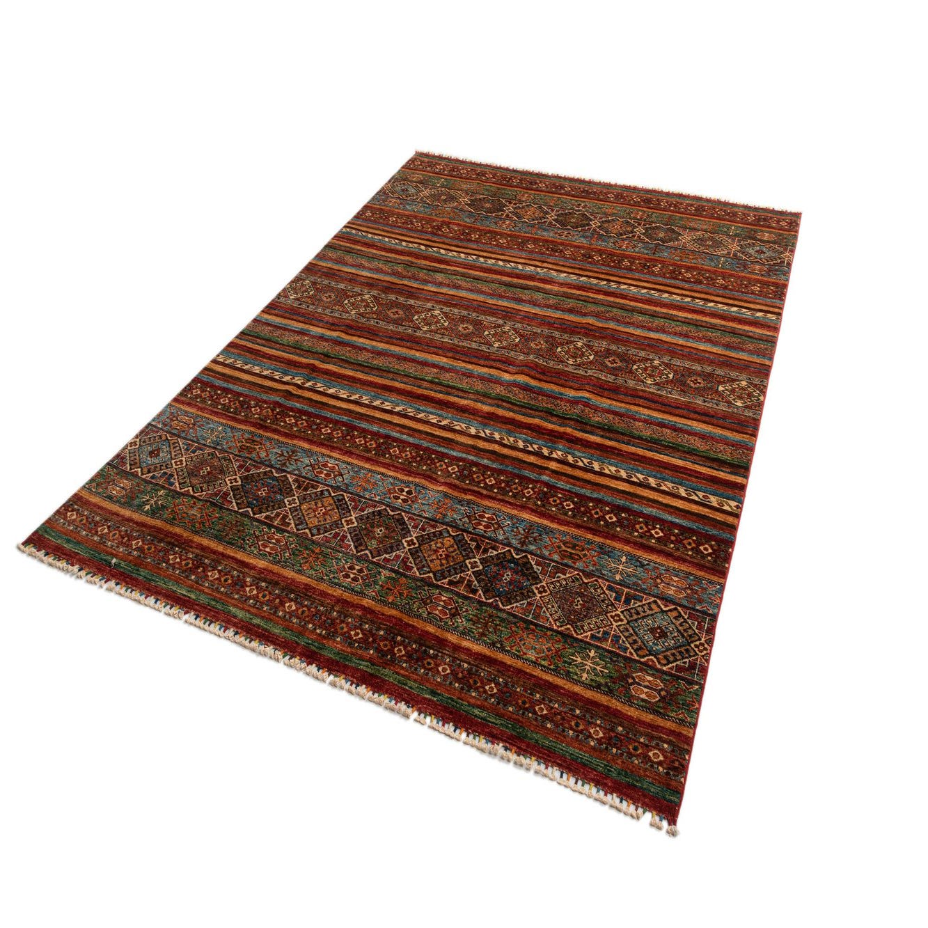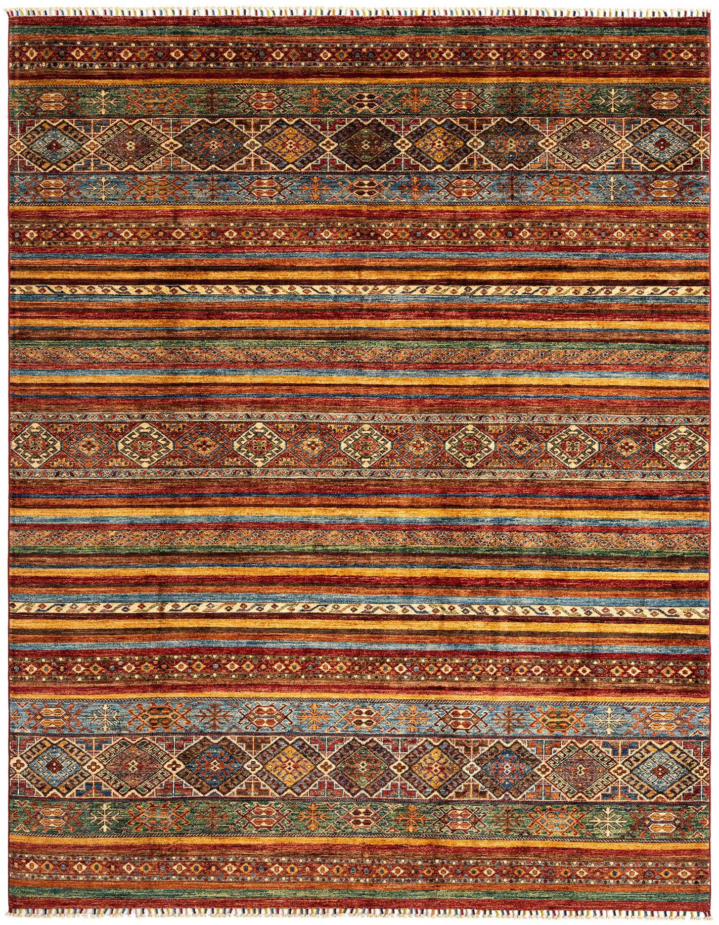 Primary color is Red. Colors in this rug include: Red, Red, Brown, Green, Blue, Orange, Cream, Yellow.