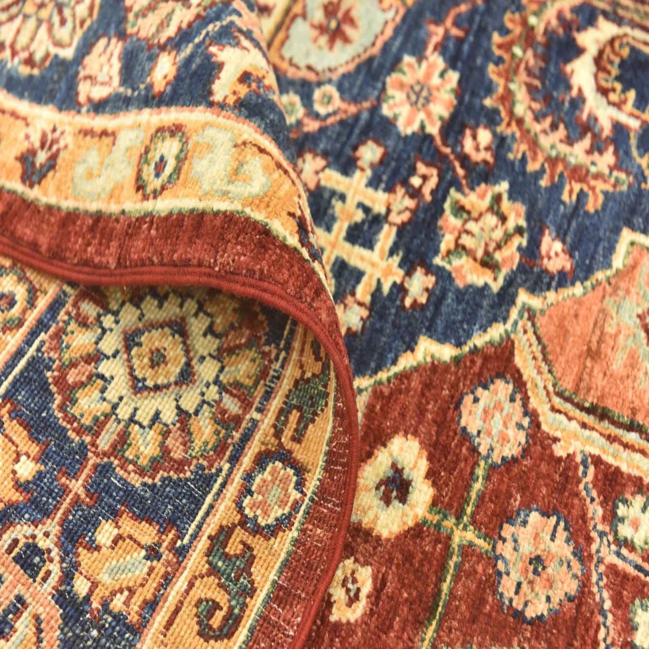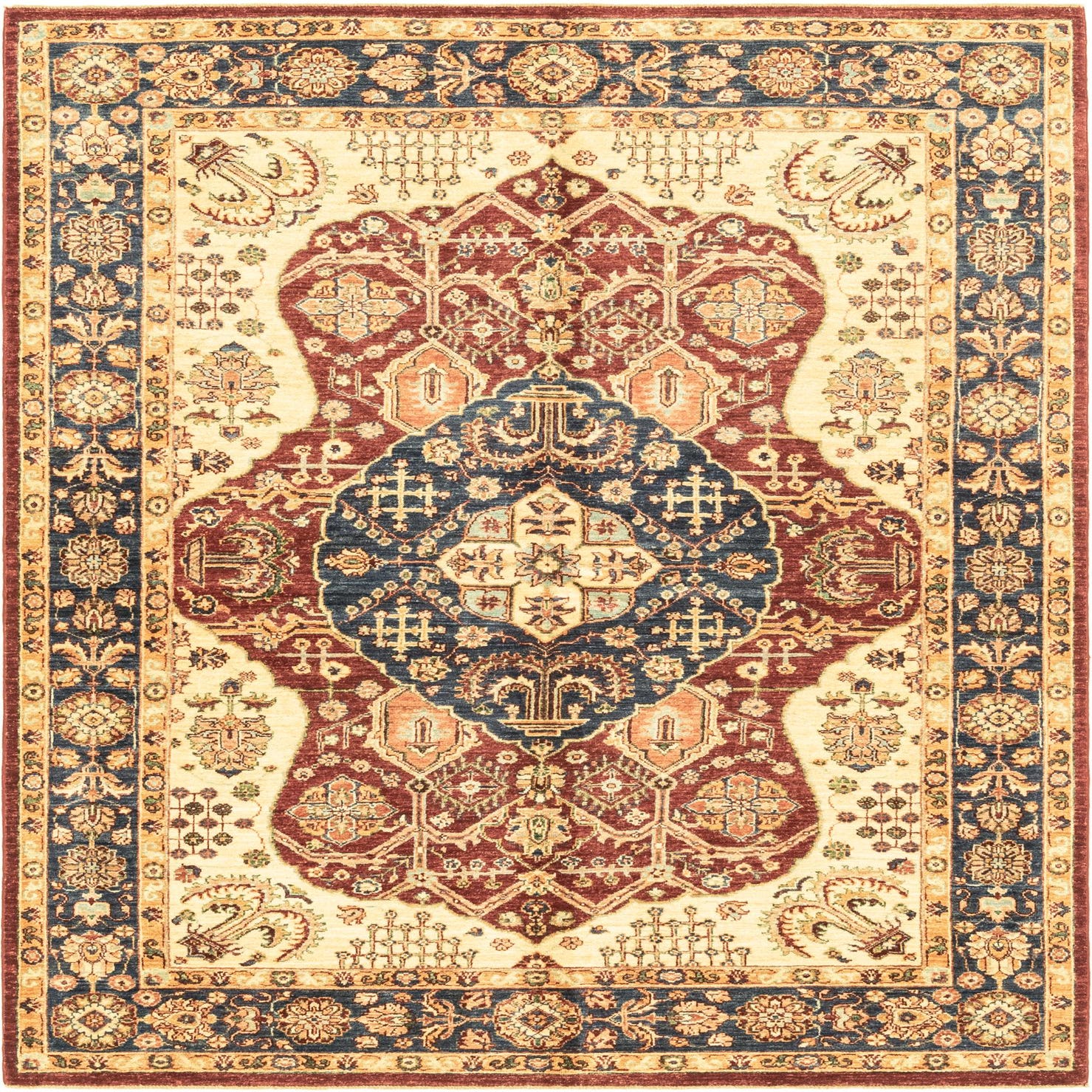 This Ariana Ziegler collection rug is a hand-knotted piece crafted from 100% hand-spun wool, offering a blend of durability and a soft, plush texture underfoot. Measuring 6x9 feet, it showcases a rich red background that serves as a sumptuous canvas for an intricate pattern of botanical and geometric motifs. The design language speaks of traditional elegance with a central medallion and complementary corner brackets, surrounded by a detailed border that encapsulates the sophistication of the pattern work.