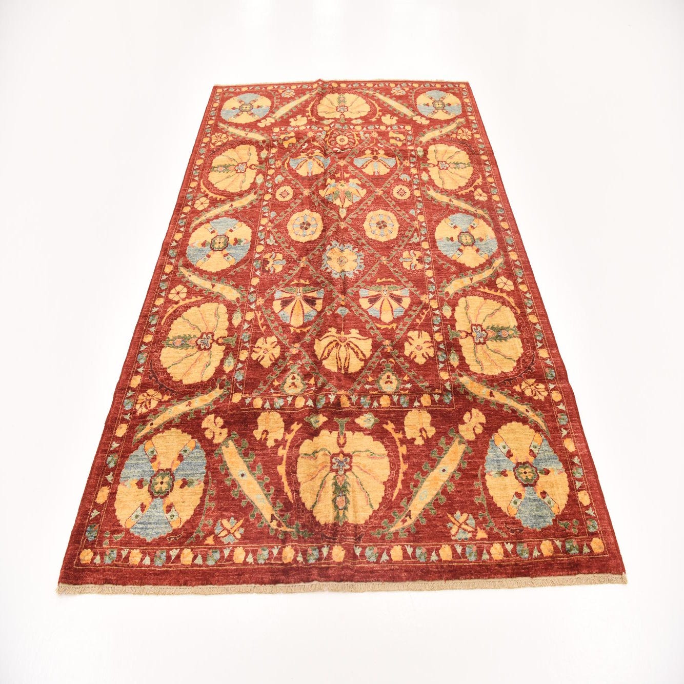 A 6x9 rectangular Ariana Ziegler rug featuring a rich red background with intricate gold, blue, and green tribal and oriental floral patterns.