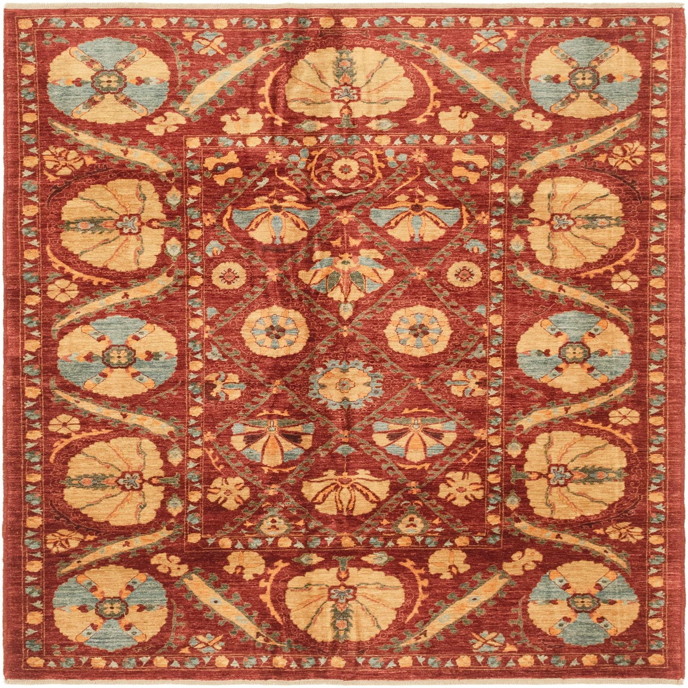 Primary color is Red. Colors in this rug include: Red, Black, Blue, Gold, Olive, Peach, Light Blue.