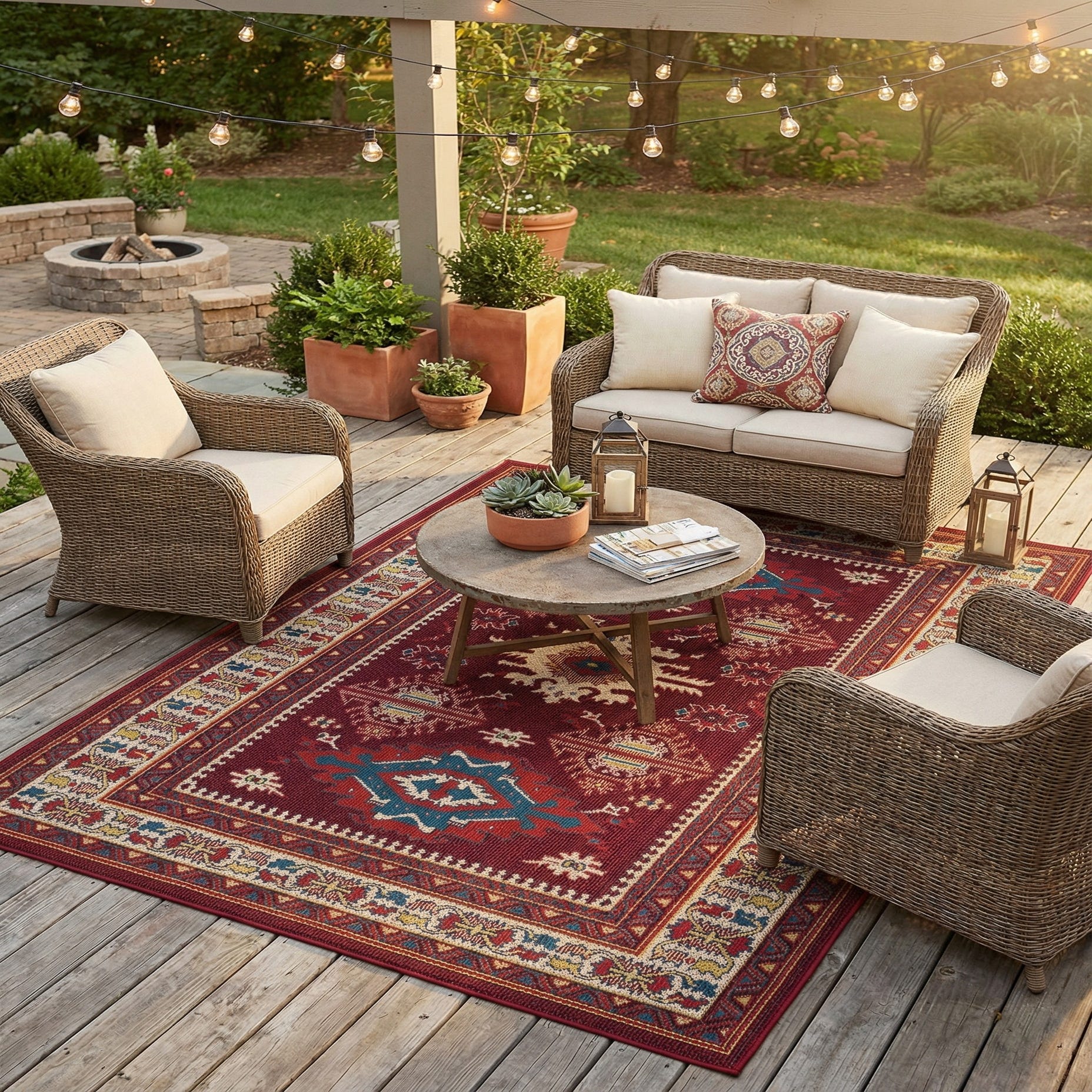 Machine-made of 100% polypropylene, the rug has a low-profile, tightly woven face that feels slightly textured and firm underfoot, maintaining crisp pattern detail. Its durable construction makes it well suited for covered patios, sunrooms, or high-traffic indoor spaces like entryways and dining areas. Pair it with warm wood furniture and neutral upholstery to let the colors pop, or combine with woven rattan and brass accents for a relaxed, collected look.