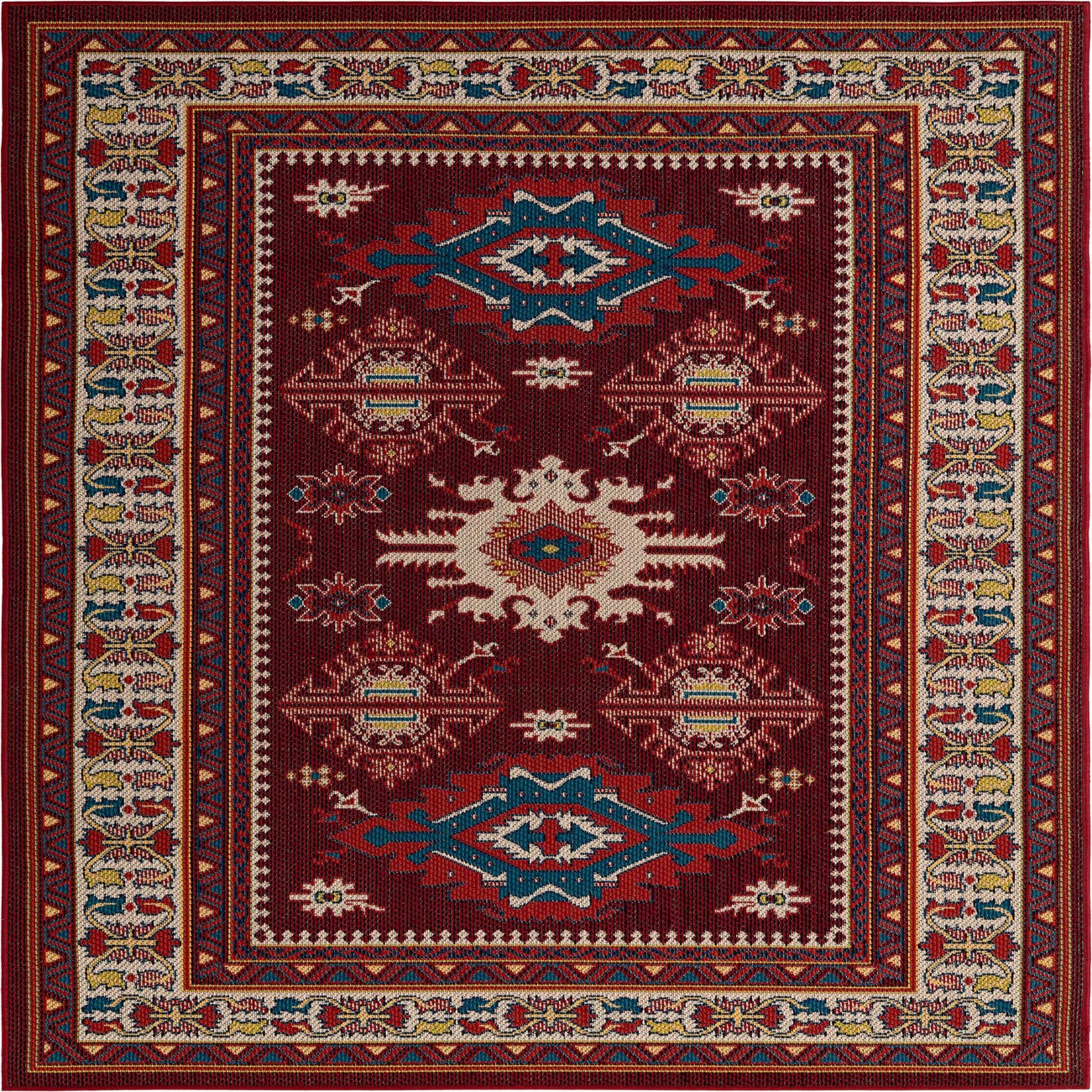 A rich red field sets the stage for a classic geometric medallion layout, where a central ivory starburst is flanked by bold navy-blue motifs and smaller accents of yellow and pink. A series of inner guard borders — including an ivory band patterned with a chain of stylized palmettes — frames the composition and sharpens the overall silhouette. The design blends traditional and tribal-inspired elements, offering clear, well-defined motifs and a lively color mix that grounds a room while adding visual interest.