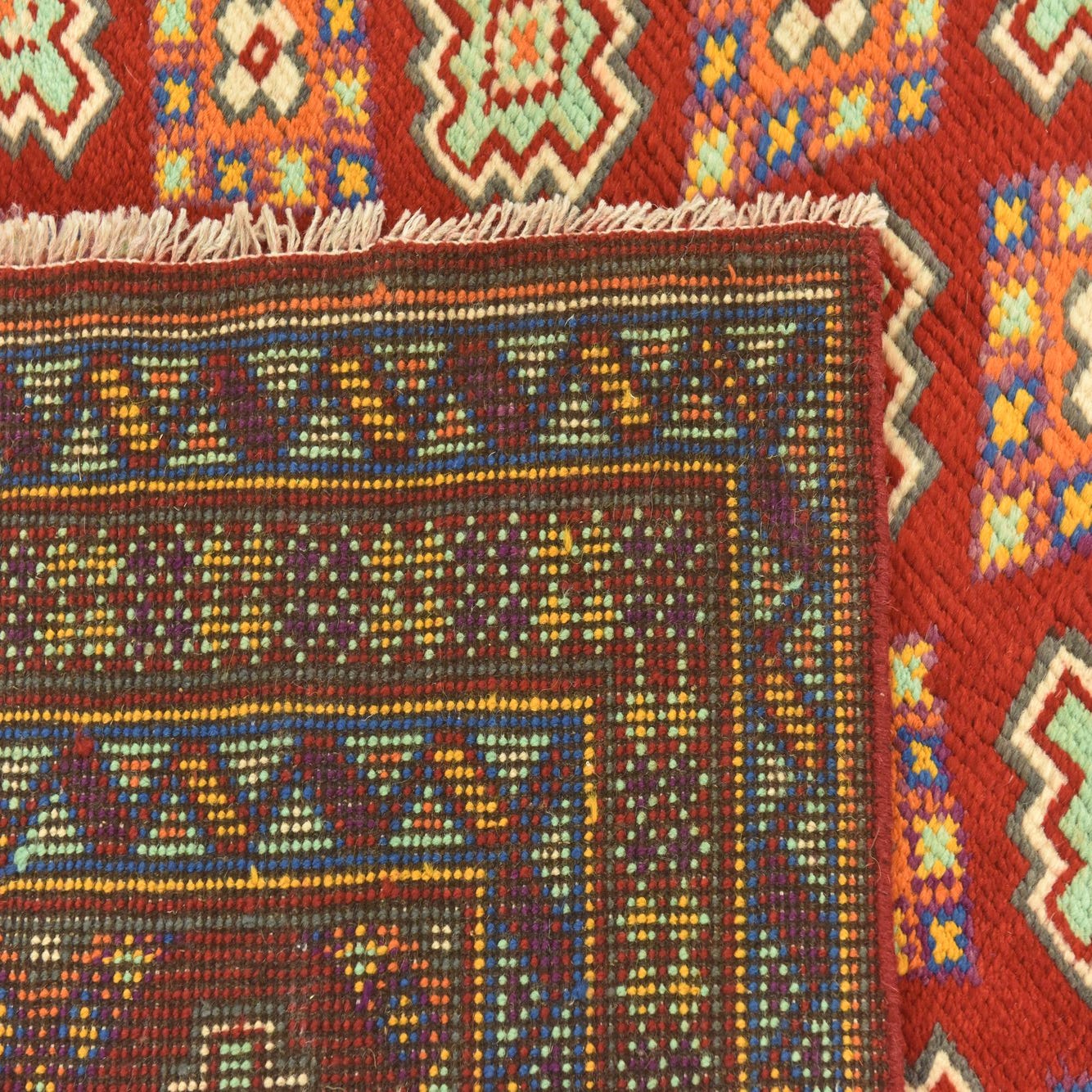 A 6x9 rectangular Balouch rug with a deep red field and intricate tribal geometric patterns in orange, blue, and cream.