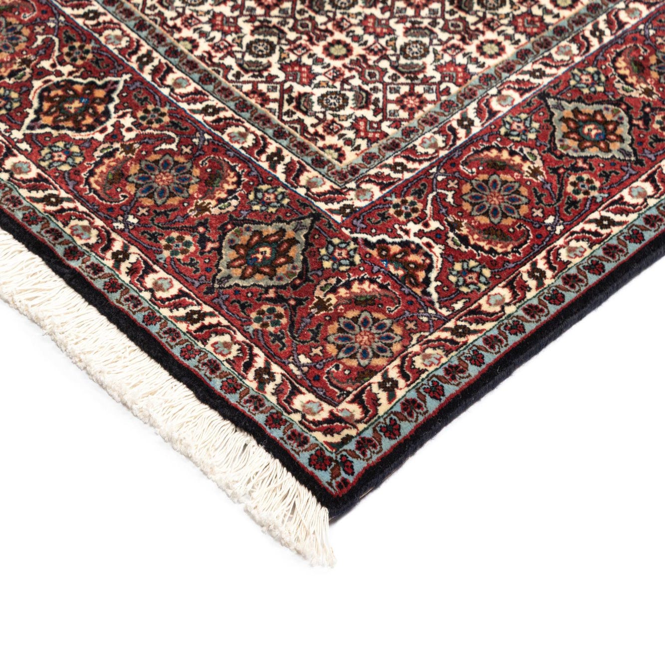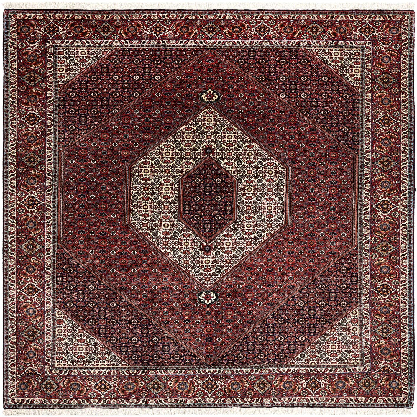 The rug features a deep red background, highlighted by intricate patterns in shades of beige, black, blue, and green. Symmetrical designs display a central diamond motif surrounded by detailed borders, exhibiting the fine craftsmanship typical of Bidjar weaves.