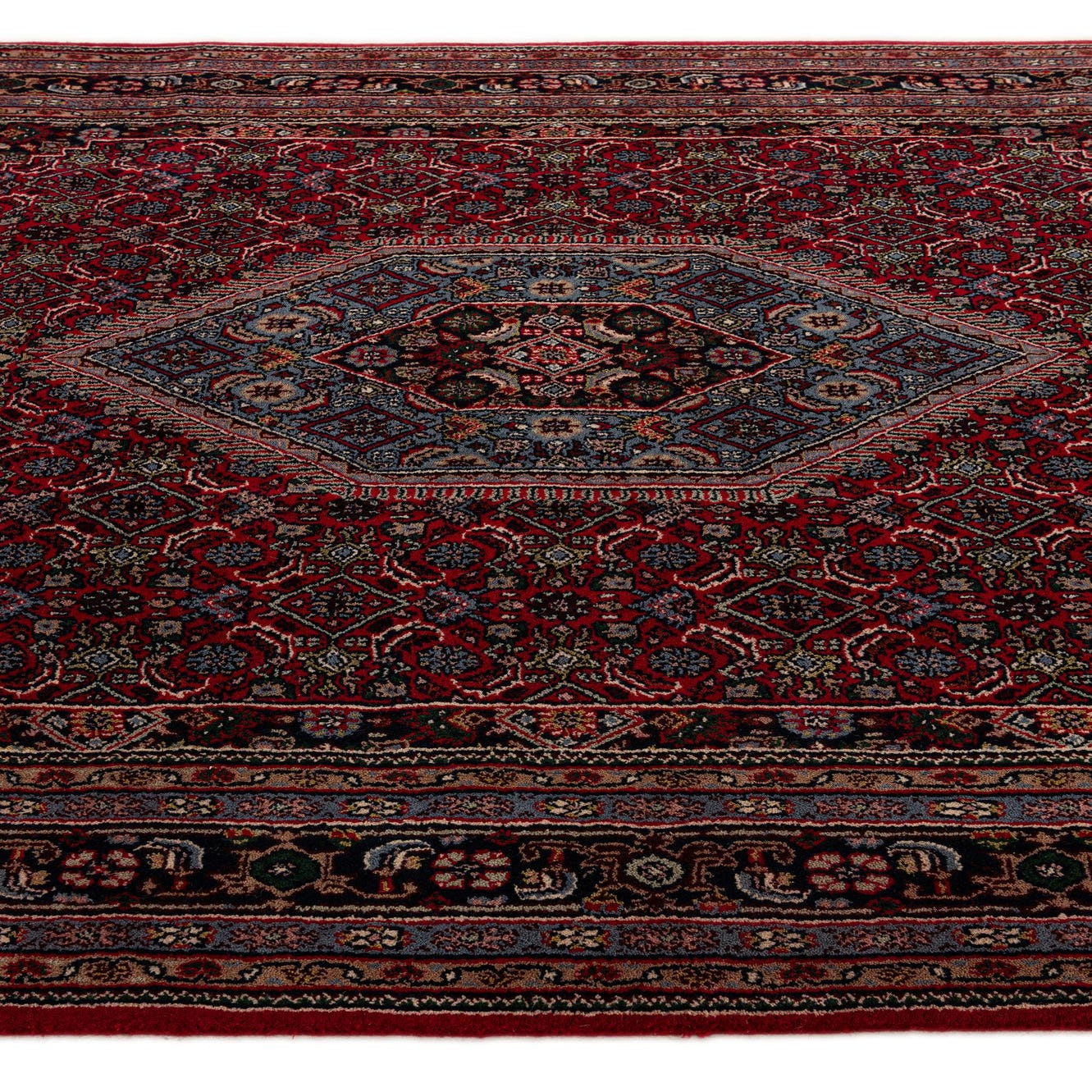 A 6x9 rectangular Bidjar rug in deep reds, featuring a traditional Oriental medallion pattern with intricate floral and geometric details, and fringed ends.