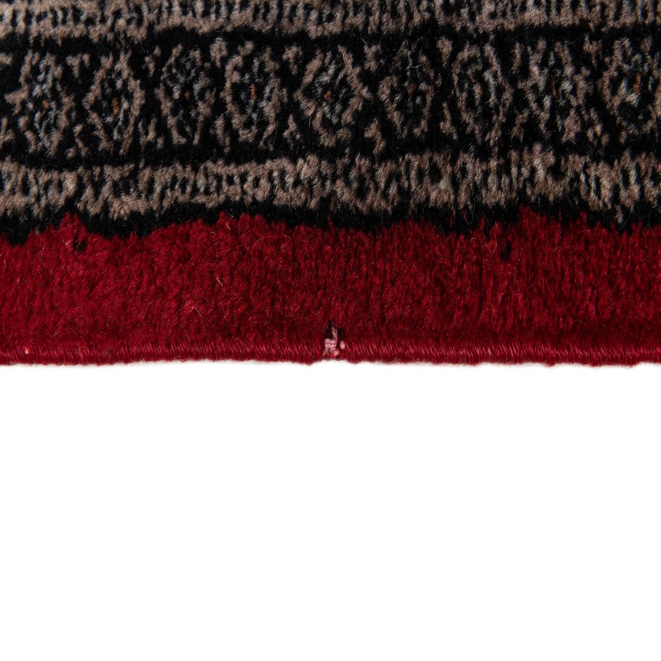 Primary color is Red. Colors in this rug include: Red, Black, Orange, Brown.
