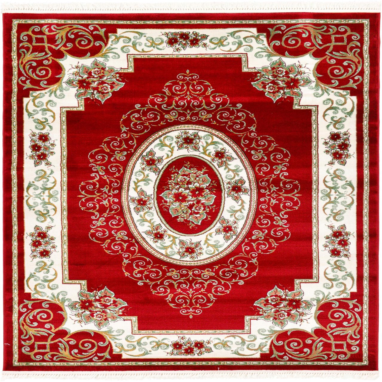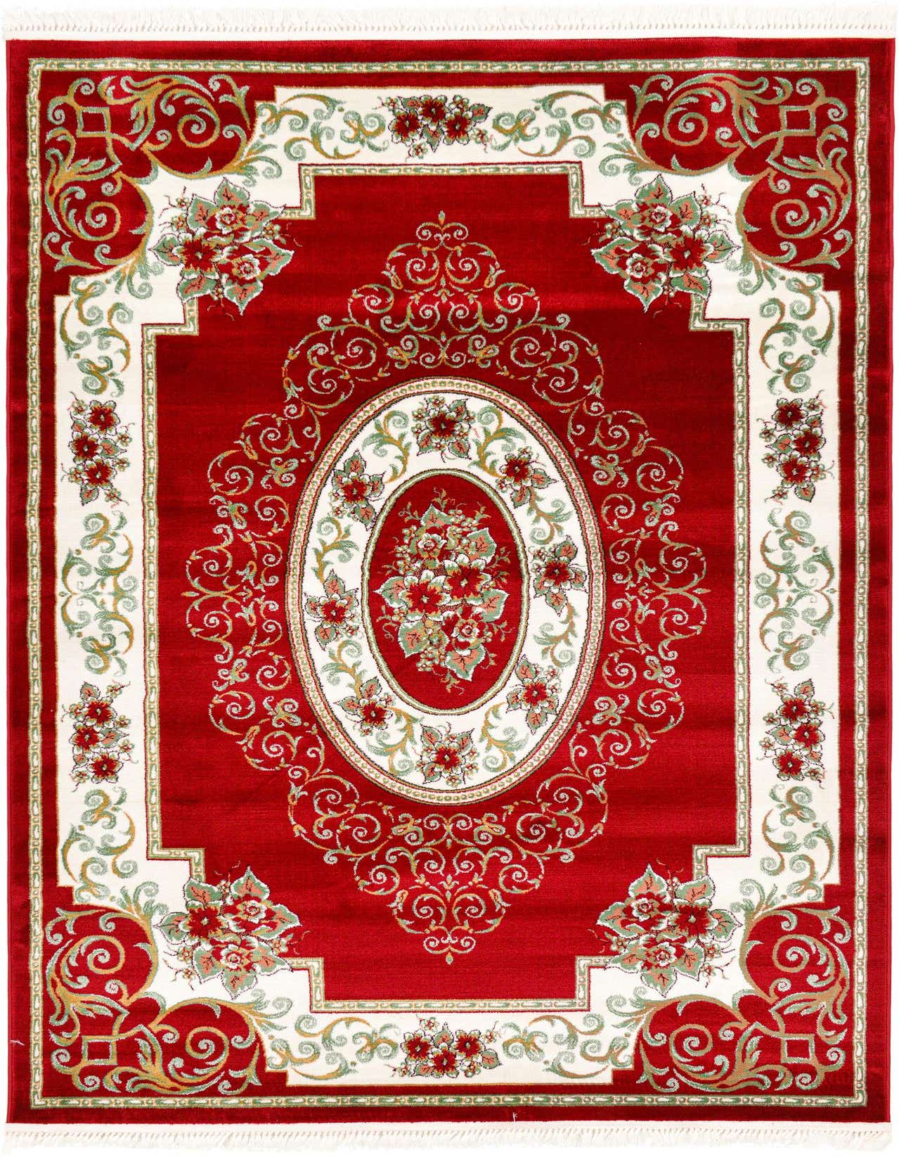Primary color is Red. Colors in this rug include: Red, Burgundy, Gold, Green, Ivory.