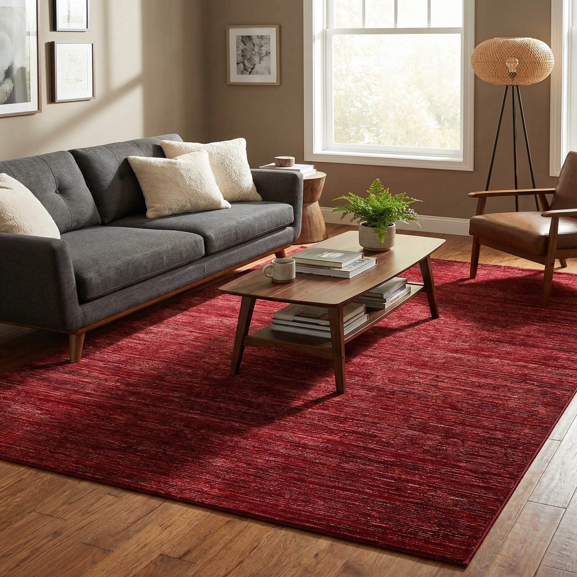 A deep red field sets the stage for a modern, linear design—fine horizontal striations in slightly darker wine and brighter cherry tones run across the surface, giving the rug a subtly variegated look rather than a flat wash of color. The pattern is contemporary and understated, relying on tonal shifts and texture instead of motifs. Machine-made from 60% polypropylene and 40% polyester, the rug has a low, dense pile with a soft hand and a gentle luster that catches light for added depth.