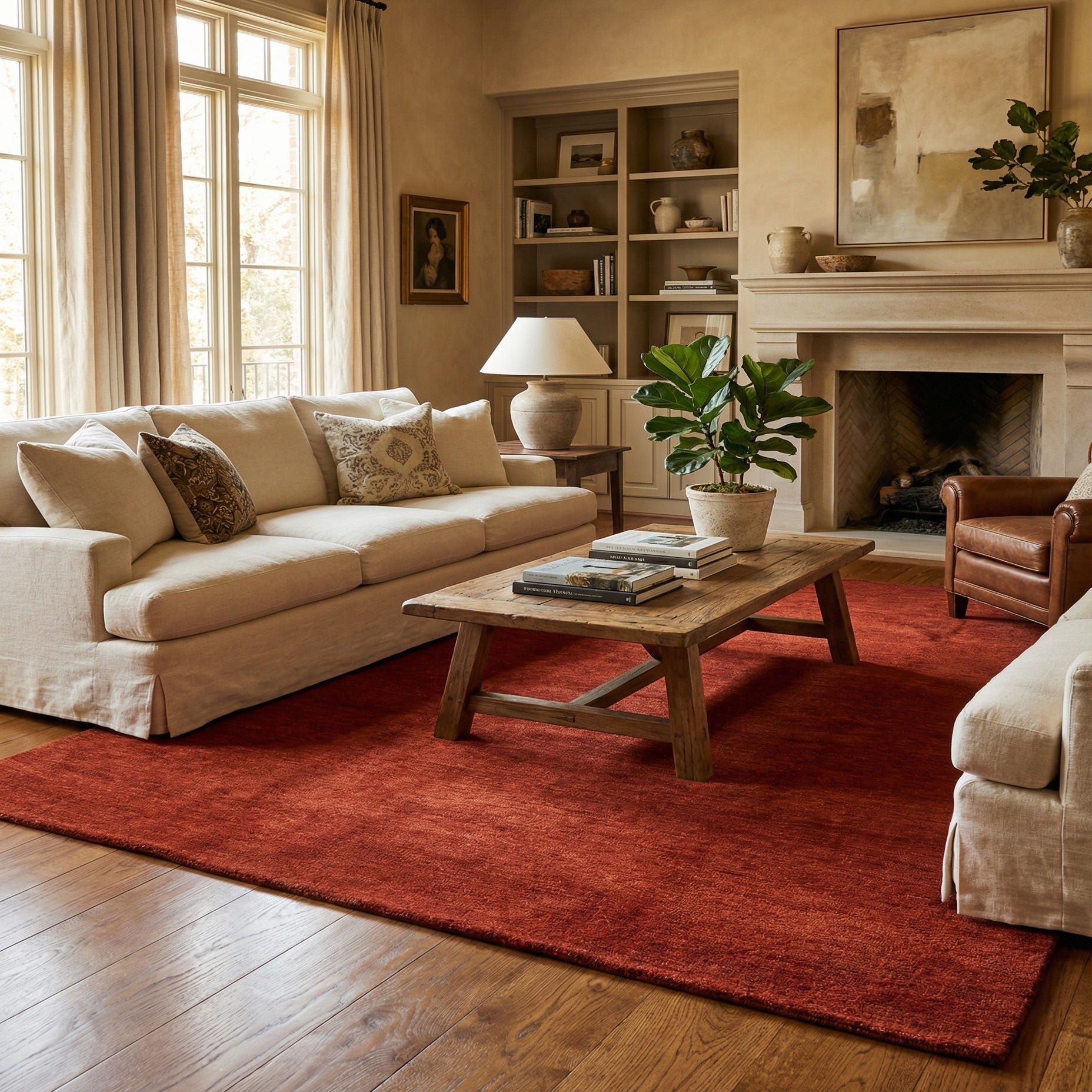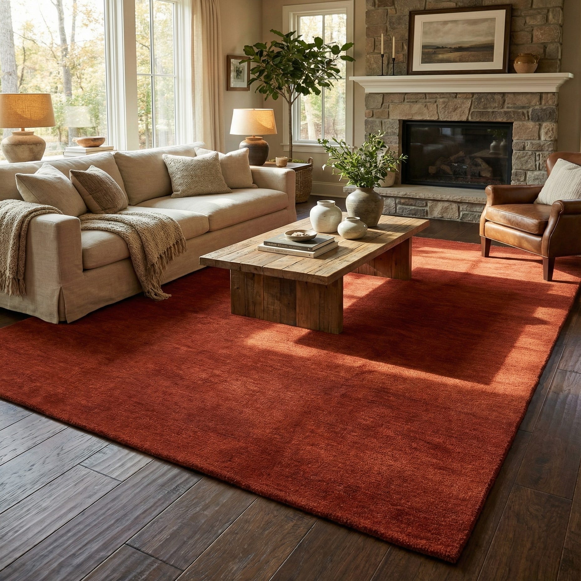 This rug works well as an anchor in a living room beneath a sofa and coffee table, as a grounding layer under a dining set, or as a bold, warm statement in an entry or study. Pair it with warm wood tones and brass or black metal accents for a mid-century modern look, layer it with textured throws and patterned pillows for a cozy eclectic vibe, or keep surrounding furnishings neutral and streamlined to let the color do the work in a minimalist interior.