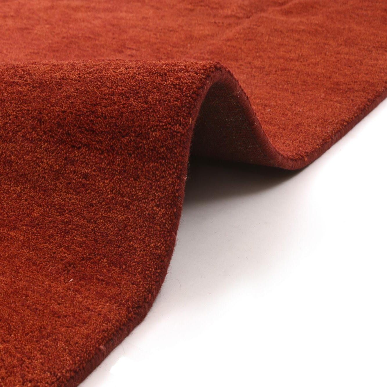 A warm, single-field red forms the heart of this hand-knotted wool rug, with subtle tonal variations that give the surface depth and a gently lived-in character. The design is intentionally restrained — a mostly solid field with fine, irregular shading and slight variations in pile that catch light and invite touch. The wool pile is dense and low, offering a soft but sturdy feel underfoot and a matte, natural luster that complements both classic and contemporary furnishings.