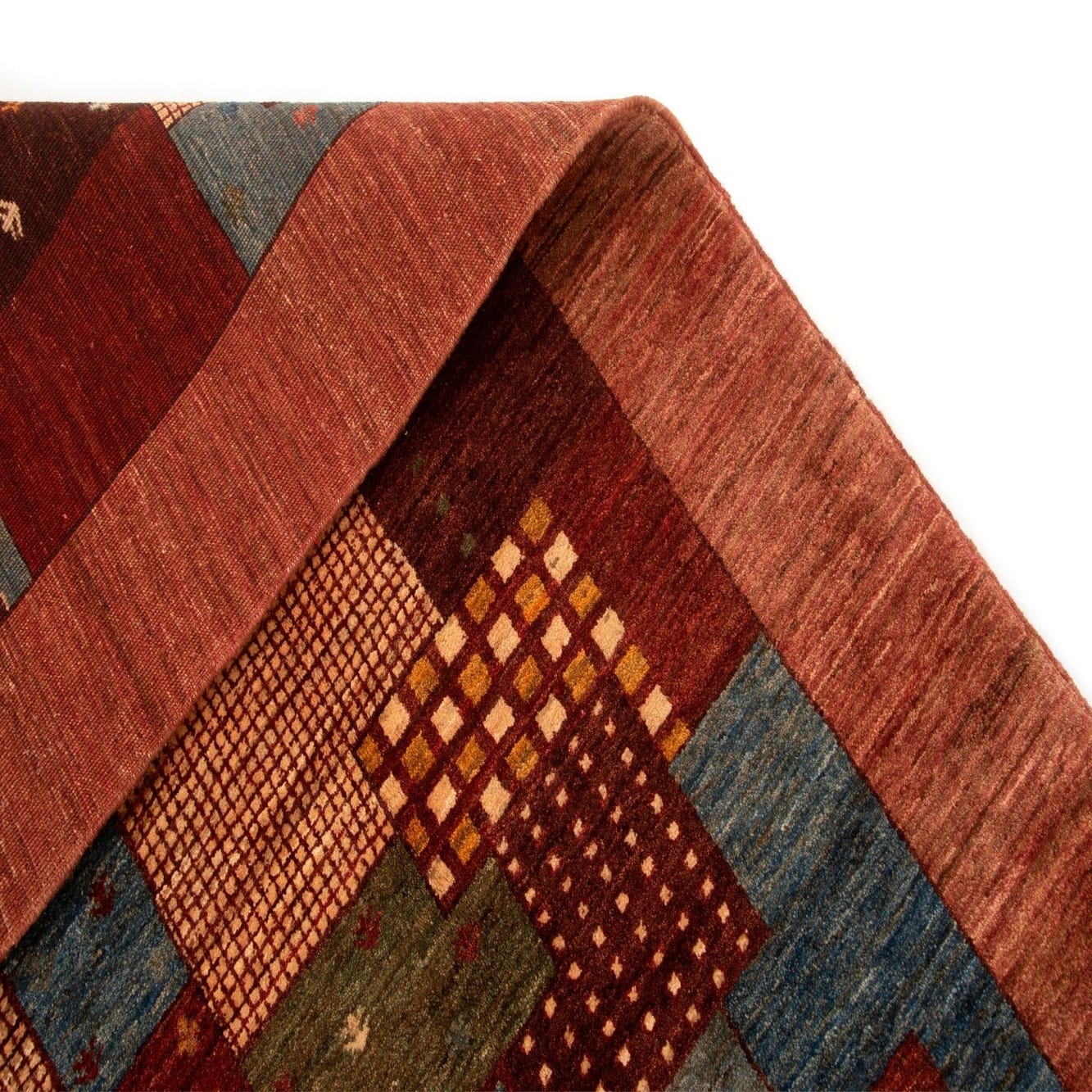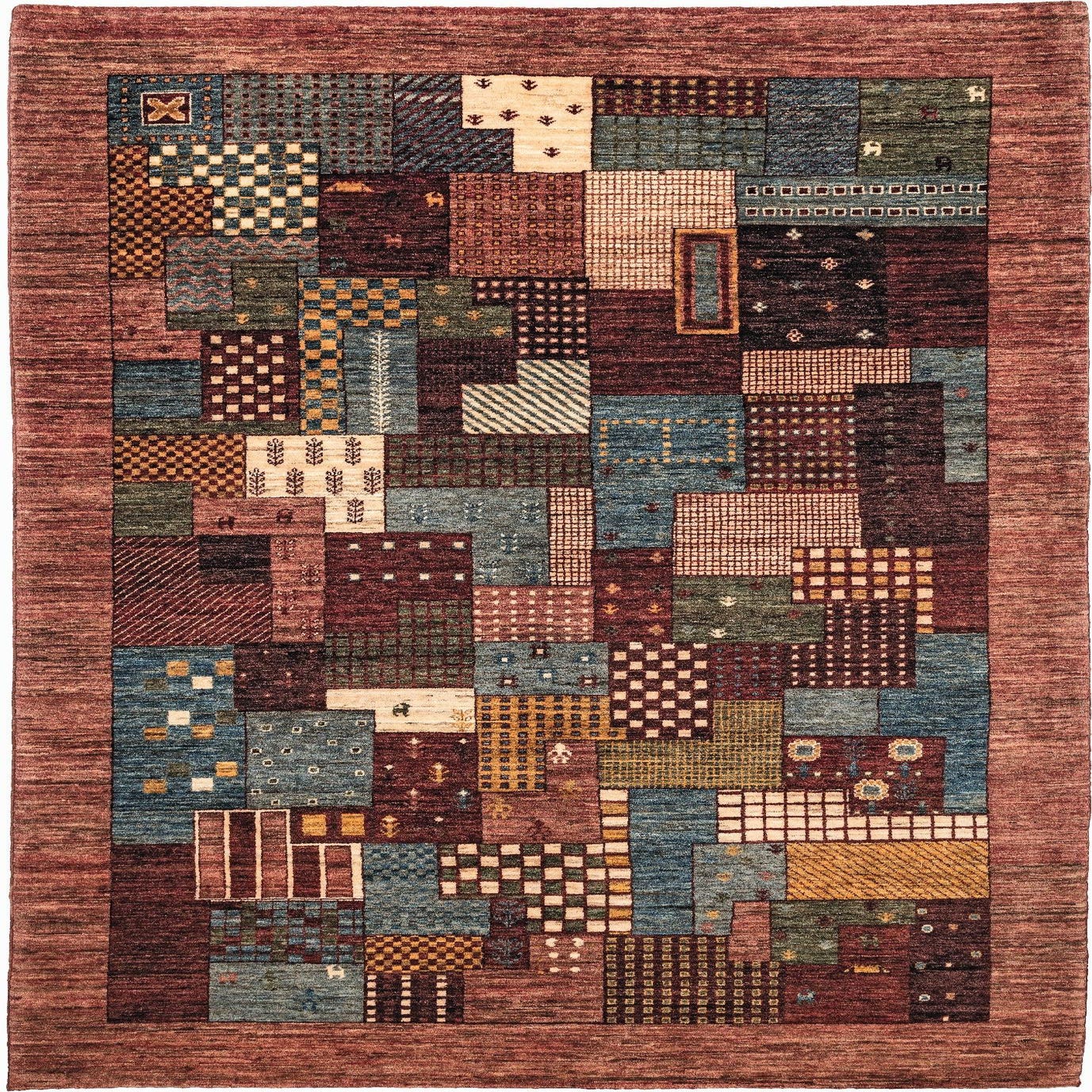 A 6x9 rectangular Gabbeh rug featuring a modern patchwork design in various shades of red, blue, green, and cream, with a solid red border.