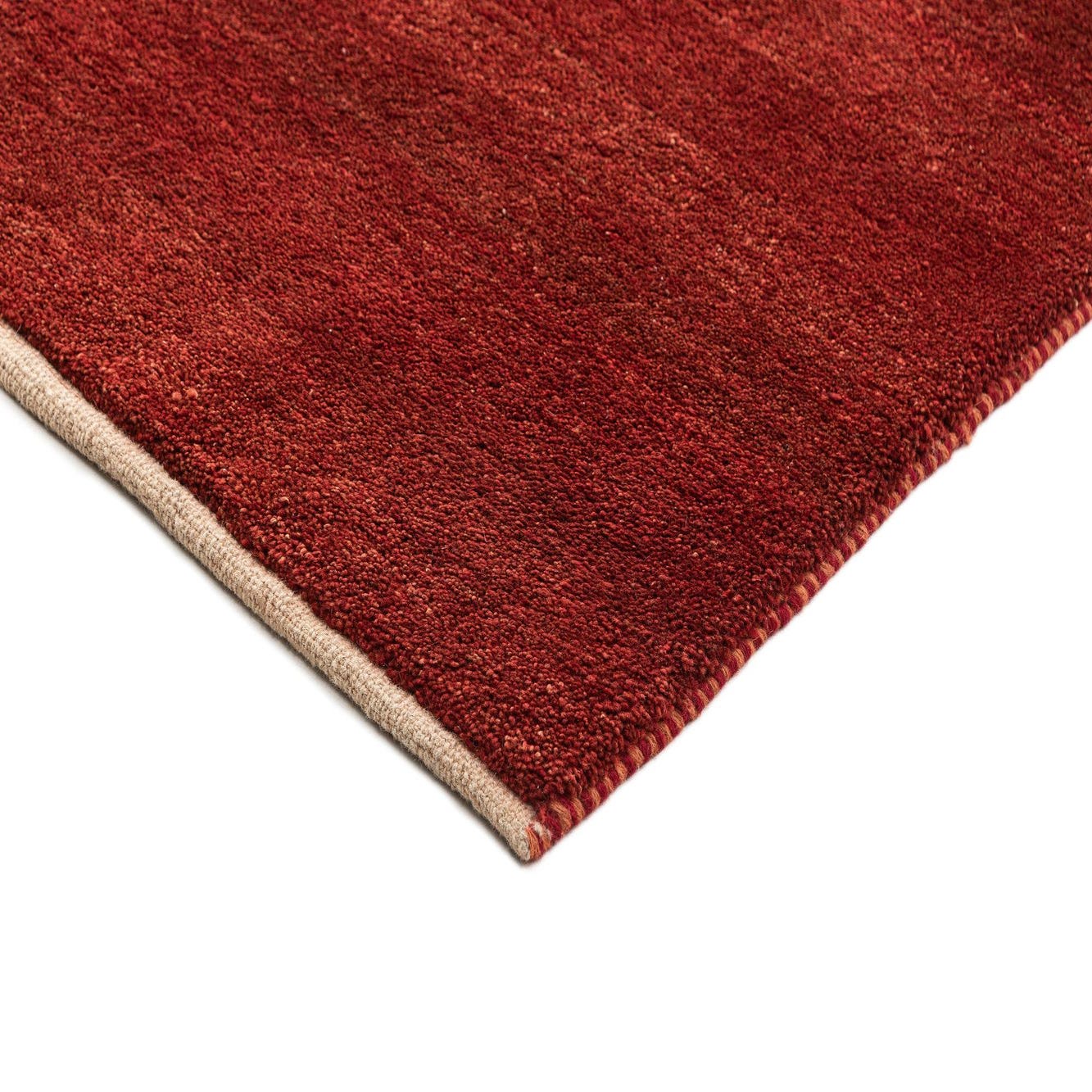 A 6x9 rectangular Gabbeh Shouli rug in deep red sheep virgin wool with a subtle modern pattern, suitable for a living room.