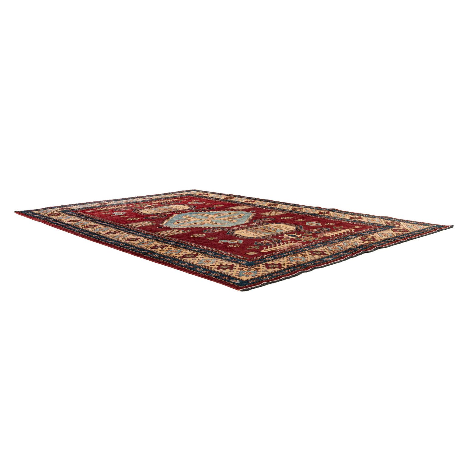A 6x9 rectangular red wool rug with a light blue and beige medallion pattern and intricate oriental borders.