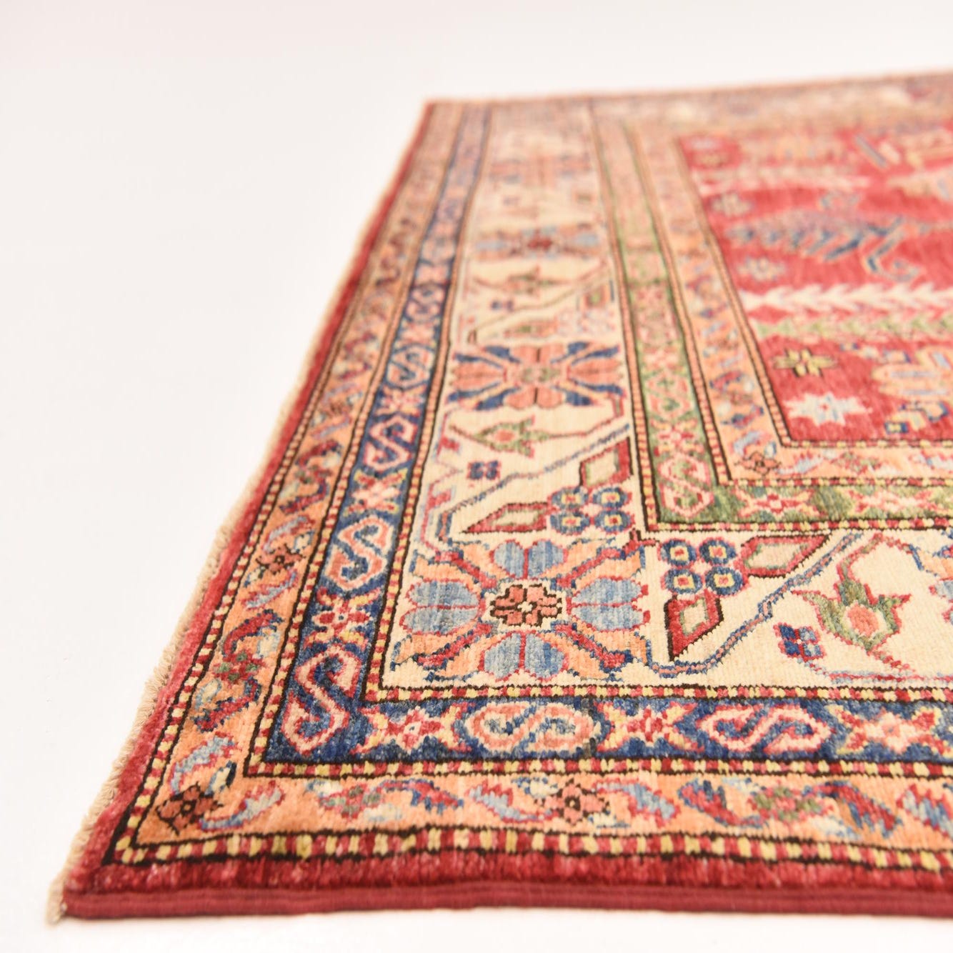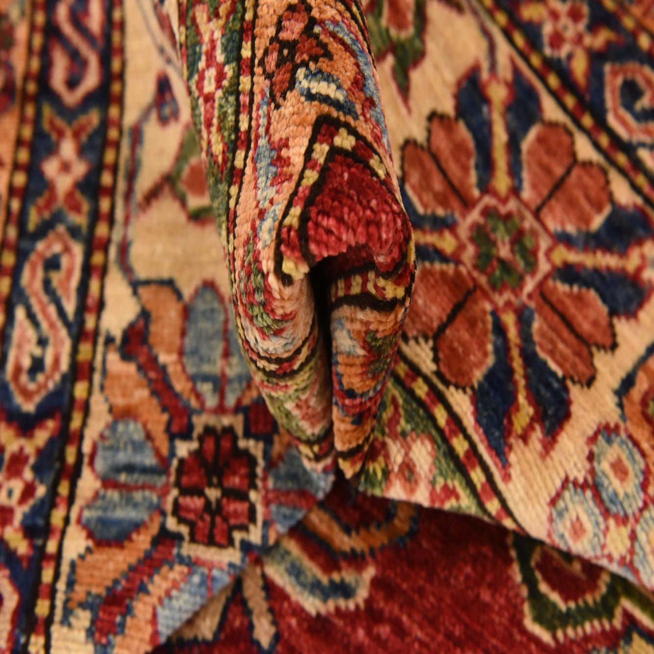 The Kazak collection rug presents a dynamic visual experience with its rich pattern and robust palette, combining traditional geometric motifs with tribal symbols. Hand-knotted from 100% hand-spun wool, this 6x9 piece boasts a tactile quality that speaks to its artisanal craftsmanship. Its background color is a striking red, complemented by an intricate array of colors including black, blue, brown, cream, green, navy blue, salmon, and peach. These hues combine to create a vivid tapestry that is both eye-catching and harmonious.