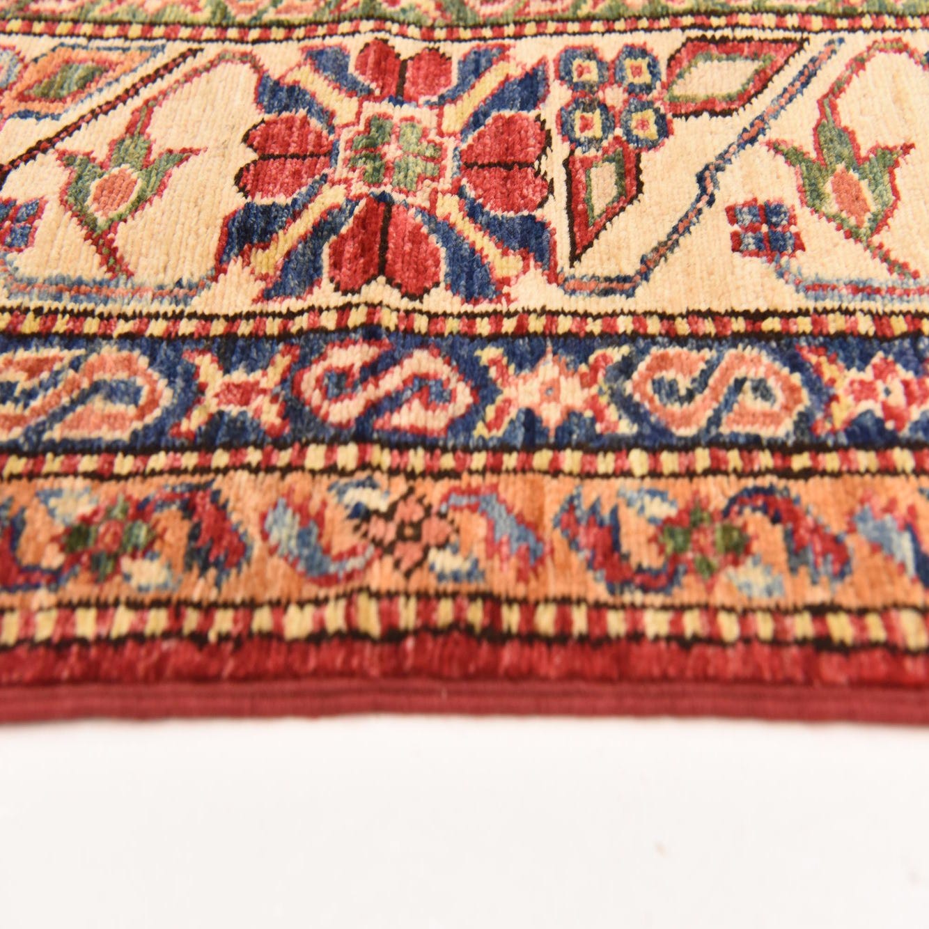 Adding to the visual texture, the rug features a border populated with detailed floral and geometric patterns that frame the central field. The deliberate use of color and symmetry reflects the heritage and time-honored techniques used in creating this piece. Finished with fringe edges, the rug offers an additional element of traditional design.