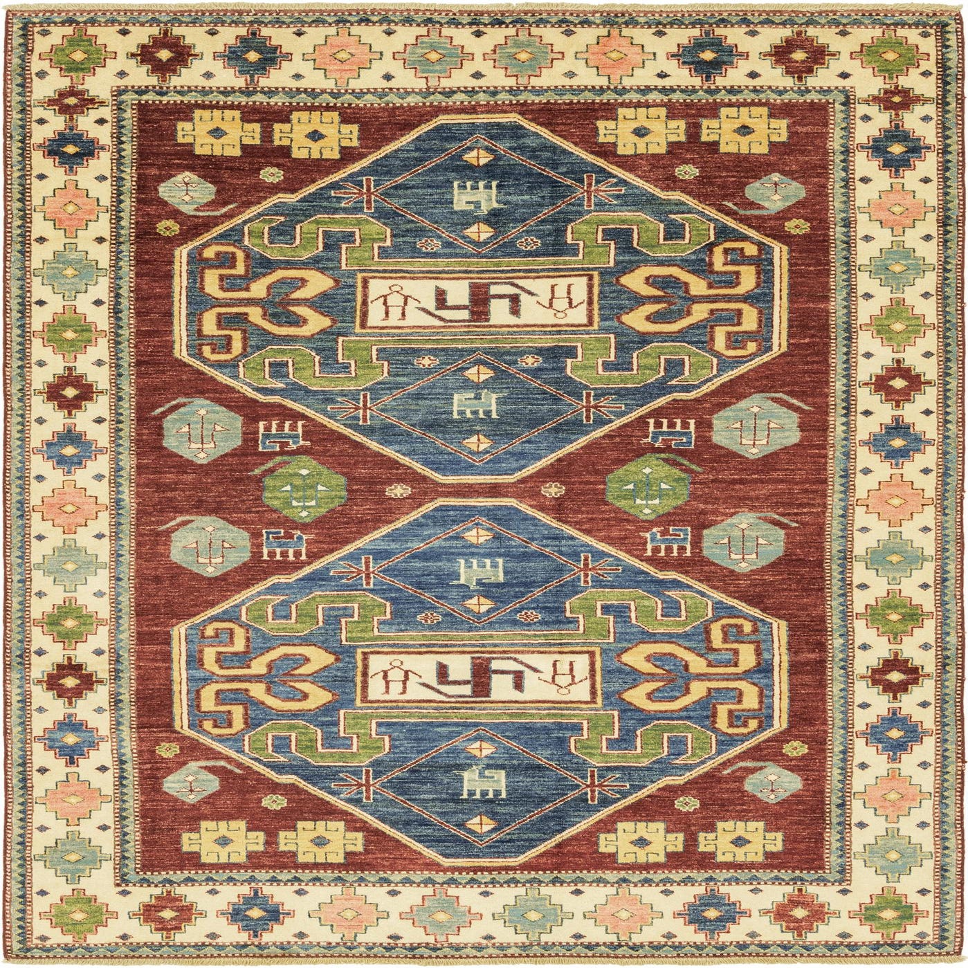This Kazak Collection rug is a 6x9 hand-knotted piece meticulously crafted from 100% hand-spun wool, boasting durability and a plush feel underfoot. The design features a bold geometric pattern with interlocking diamond motifs in a rich palette that includes red, which forms the vibrant background color. Accents of blue, brown, green, ivory, navy blue, yellow, and orange add depth and complexity to the design, while traditional fringes frame the short ends, enhancing its authentic allure.