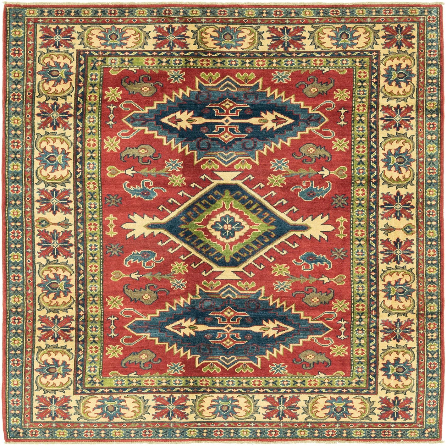 The Kazak Collection offers a 6x9 hand-knotted rug crafted from 100% hand-spun wool, showcasing a vibrant red background with a traditional design. This rug features an array of meticulously detailed geometric motifs and symbolic elements in harmonious hues of beige, blue, brown, and green. The intricate border frames the central pattern, adding to the rug's visual depth and complexity.