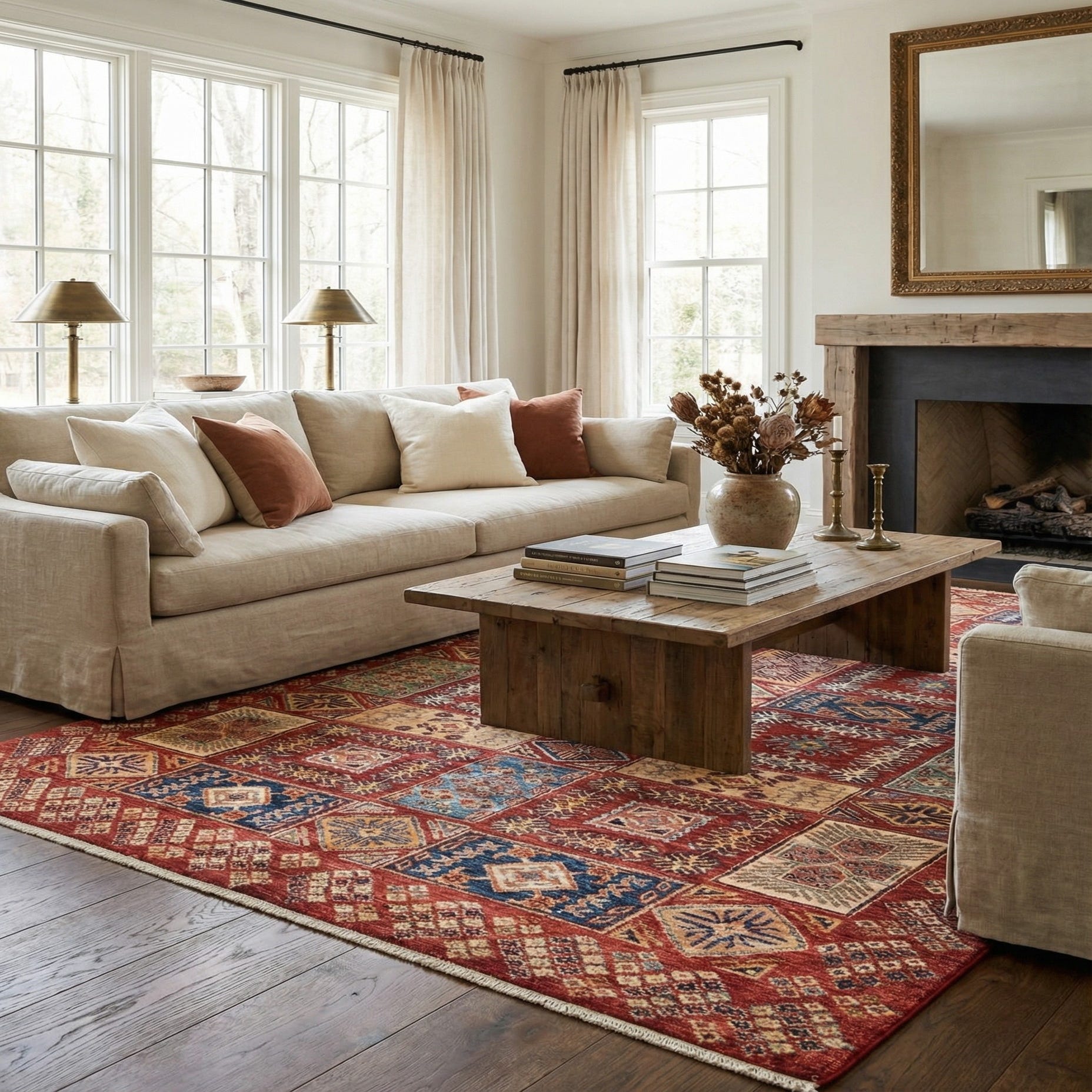 A 6x9 rectangular Kazak rug with a traditional Southwestern and tribal pattern in various shades of red, blue, and beige.