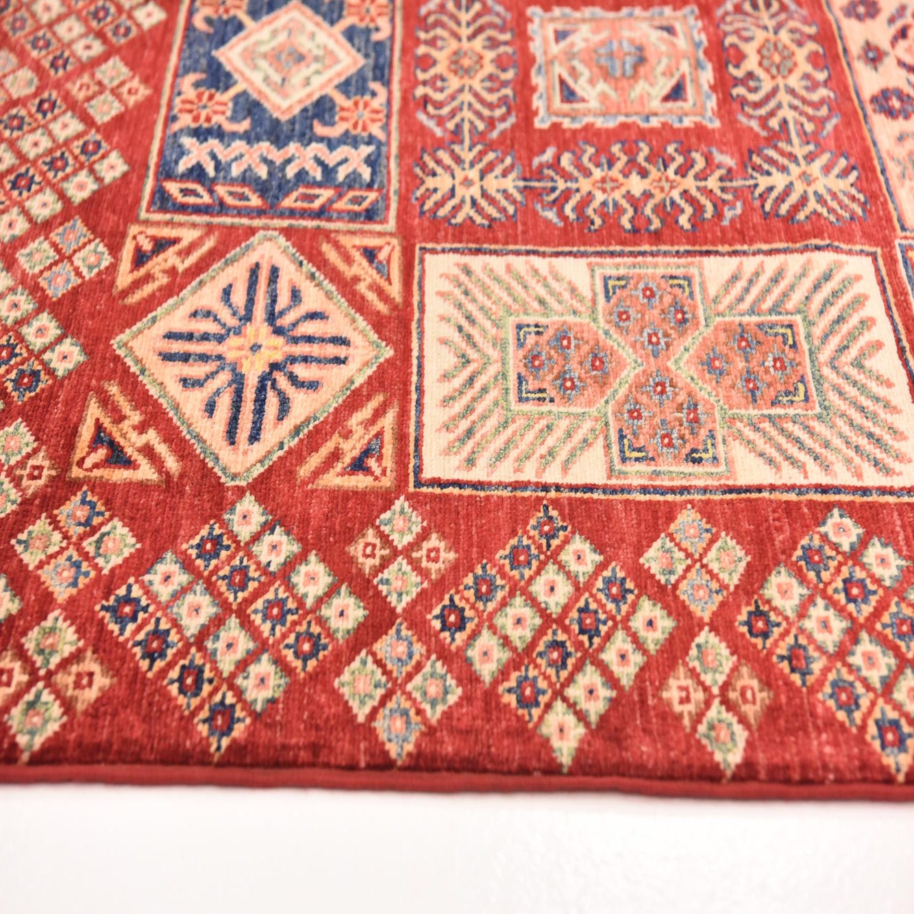 The Kazak rug is a splendid testament to traditional rug-making, hand-knotted with a 100% hand-spun wool construction, ensuring durability and a soft, tactile experience underfoot. This piece measures a versatile 6x9, suitable for a range of room sizes. It features a rich red background imbued with a dynamic array of colors including black, blue, brown, cream, green, orange, peach, and navy blue.
