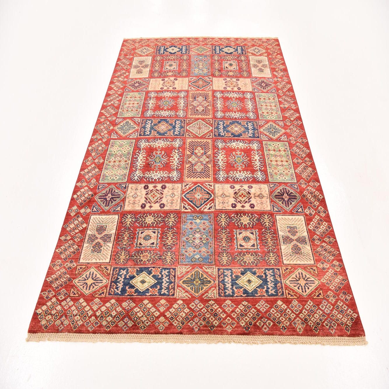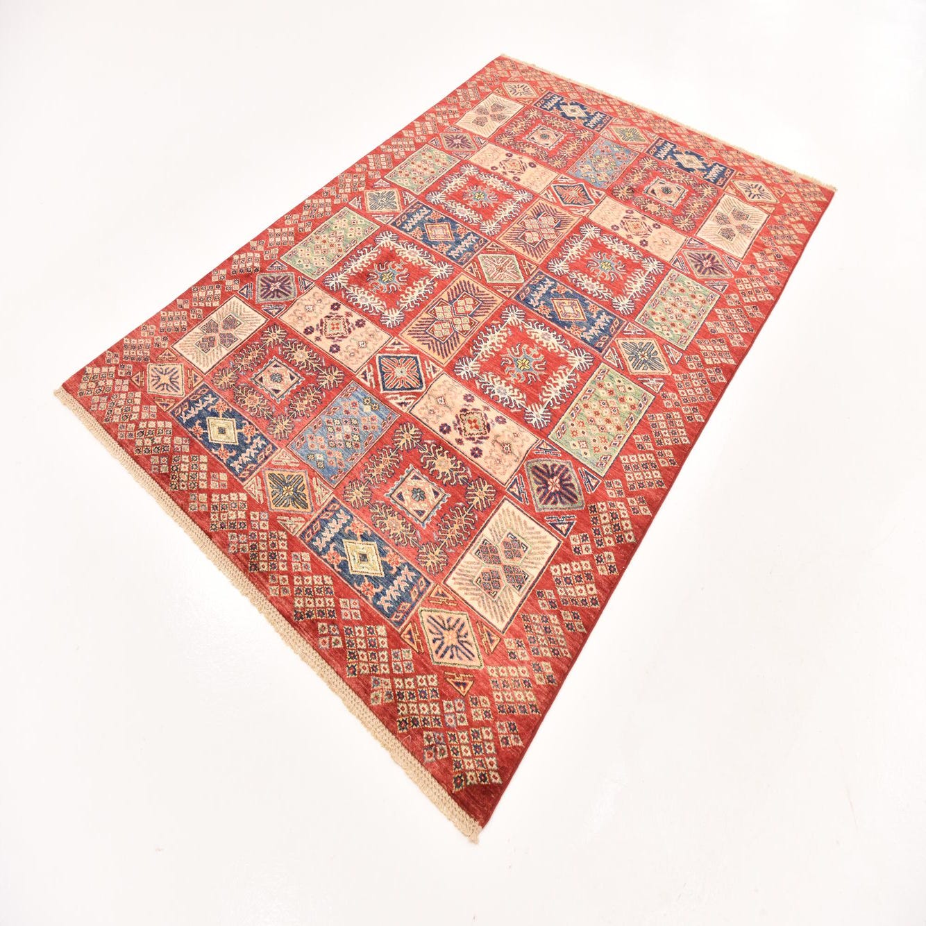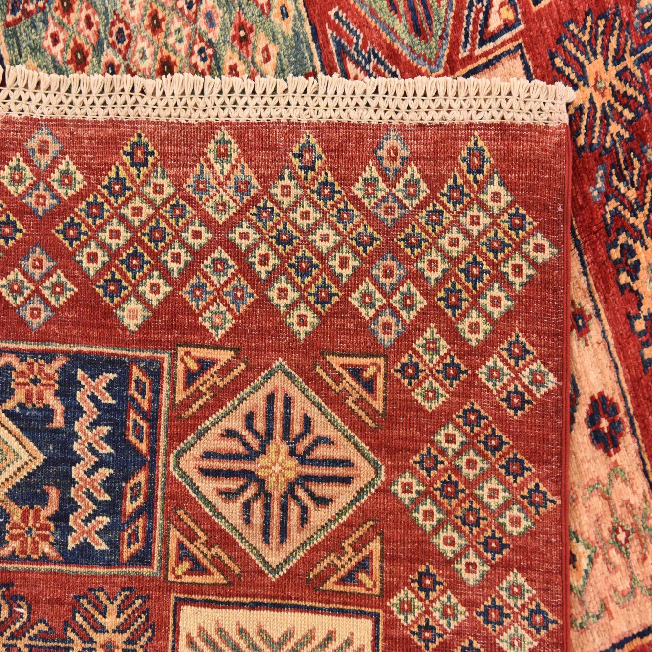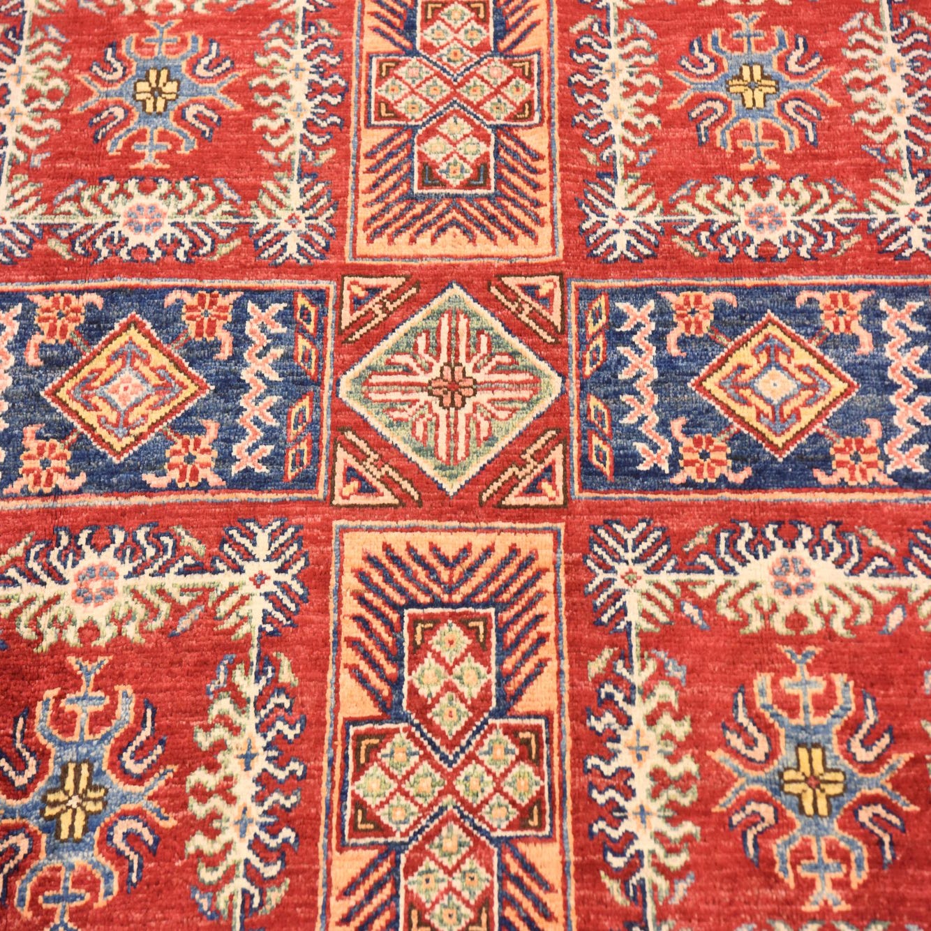 Crafted with meticulous care, this 6x9 Kazak rug is a testament to the enduring artistry of hand-knotted textiles. Made from 100% hand-spun wool, its durability is matched by a texture that is delightfully plush to the touch. The rug's design is a rich tapestry of traditional geometric motifs, thoughtfully arranged in a series of distinct, bordered compartments. The dominant red background serves as a vibrant canvas, highlighting the intricate patterns rendered in black, blue, brown, cream, and green hues that adorn each block.