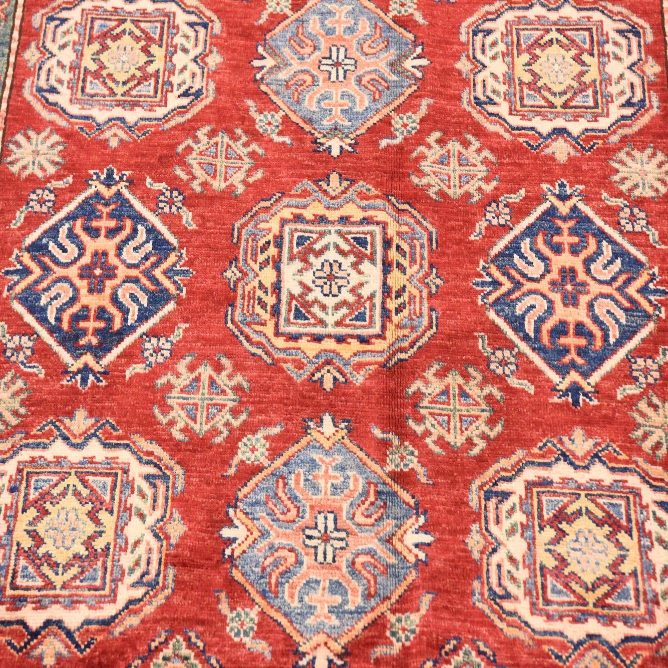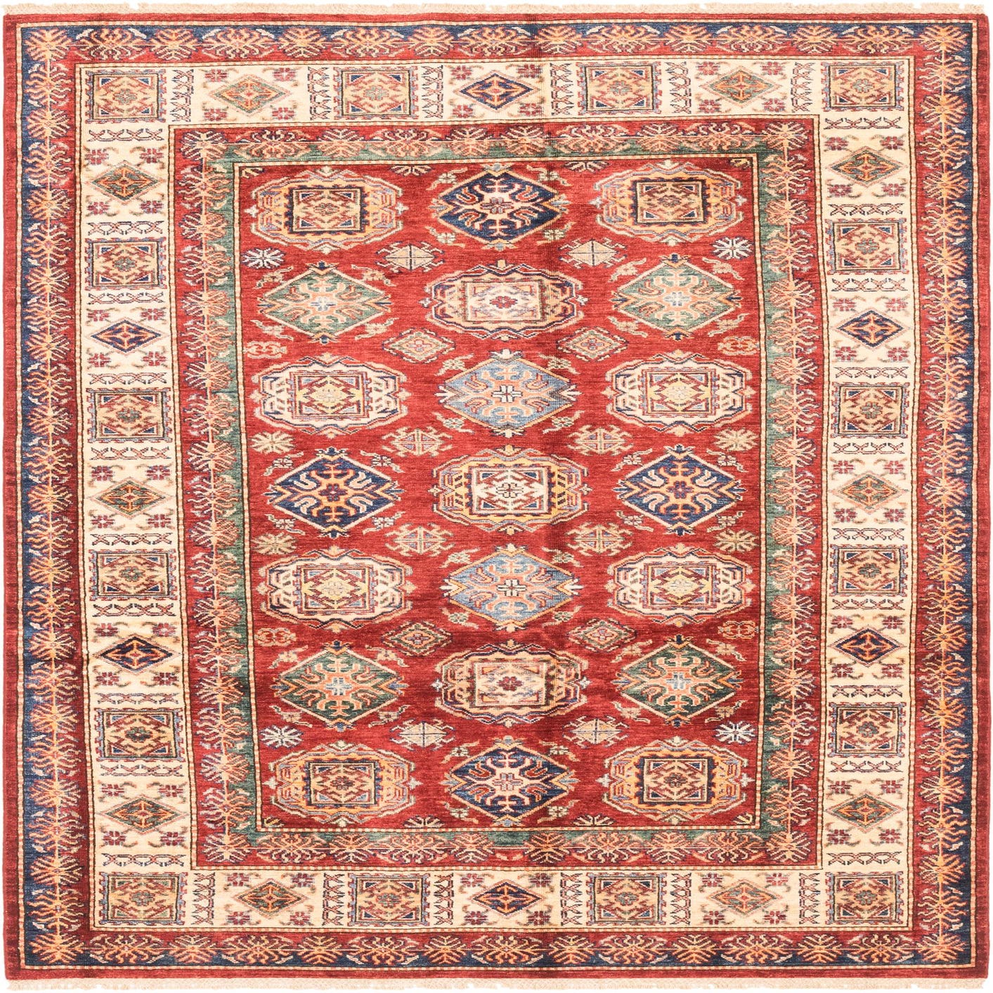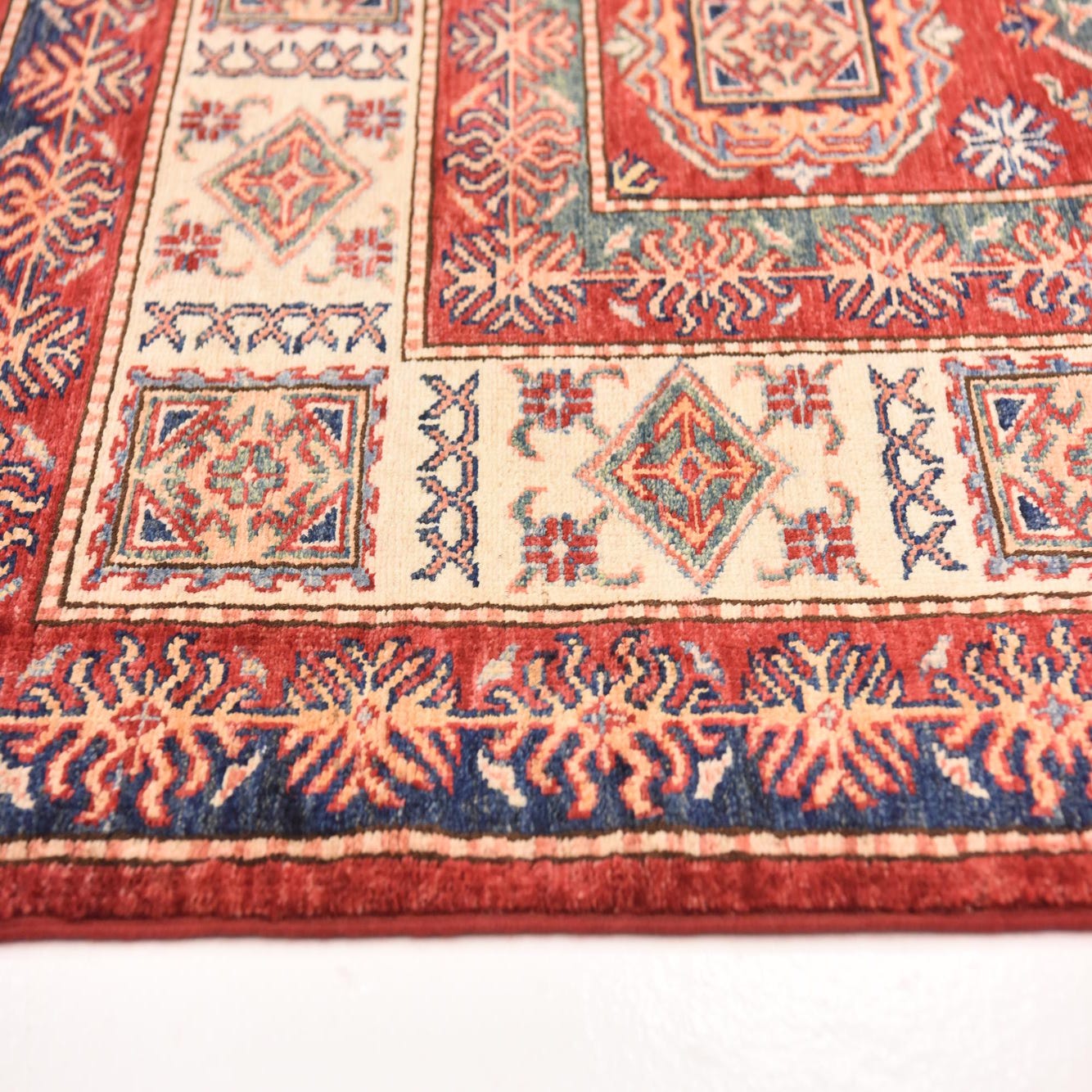 This Kazak collection area rug features a bold, traditional design enriched with a vivid palette that includes red, black, blue, brown, cream, green, navy blue, salmon, and peach. Its hand-knotted construction from 100% hand-spun wool ensures a high level of craftsmanship and durability. The distinct geometric pattern showcases various decorative motifs and framed by a contrasting border, elevating the visual interest of the piece.