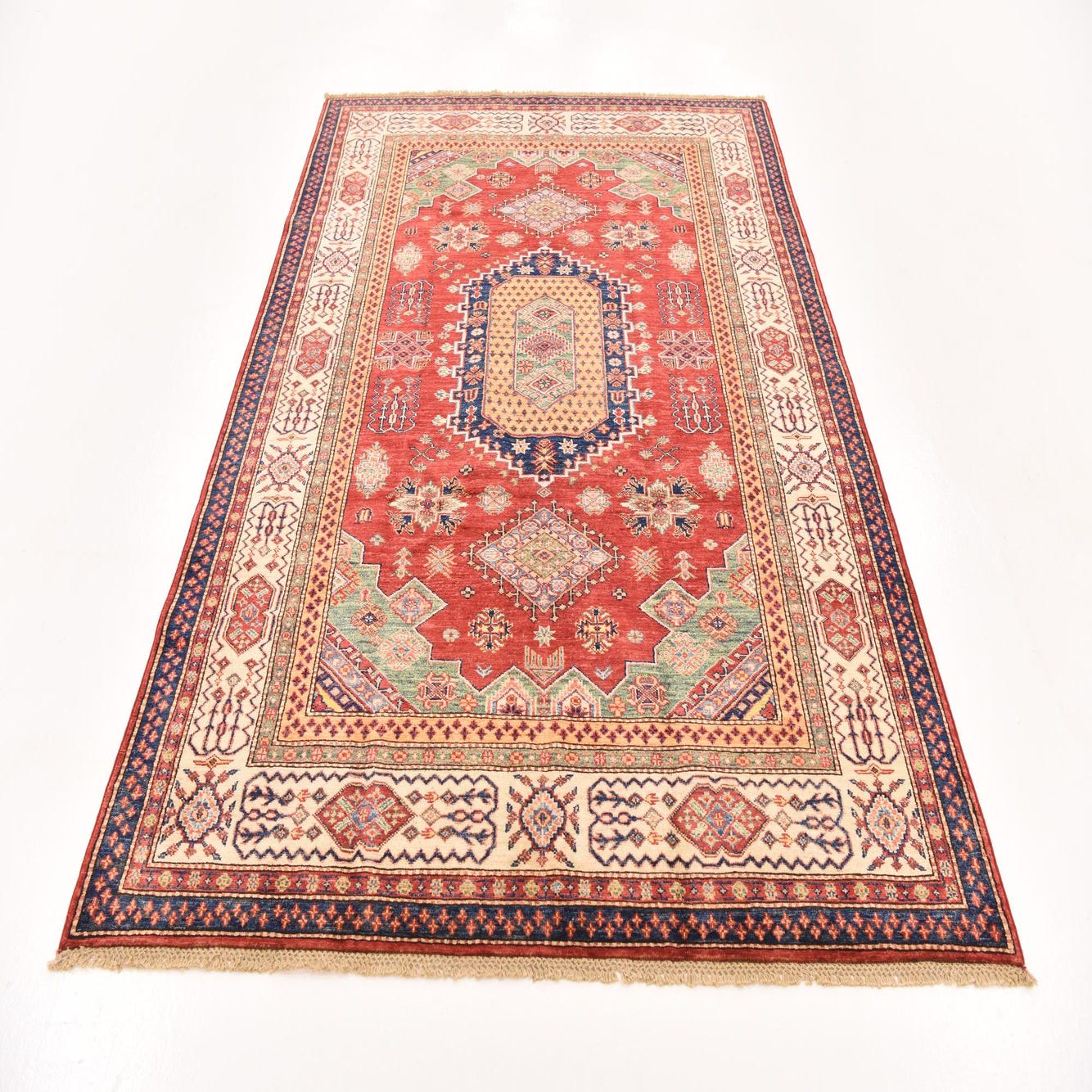 A 6x9 rectangular red traditional Kazak rug with a central medallion and intricate tribal patterns in blues, greens, and creams.