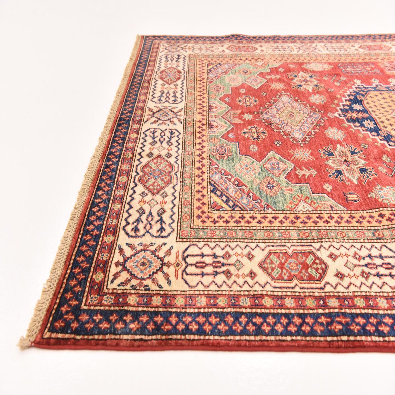 This Kazak collection 6x9 rug is hand-knotted from 100% hand-spun wool, boasting a robust texture and a durable weave. The rug features a prominent red background, complemented by an intricate geometric pattern that includes black, blue, brown, cream, green, navy blue, orange, and peach accents. Detailed borders frame the central design, adding a layer of sophistication to the rug's aesthetic.