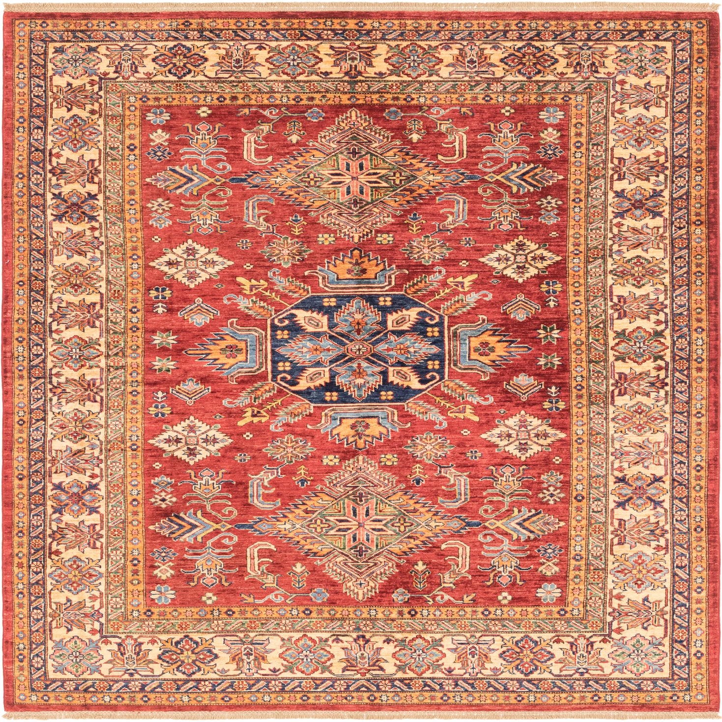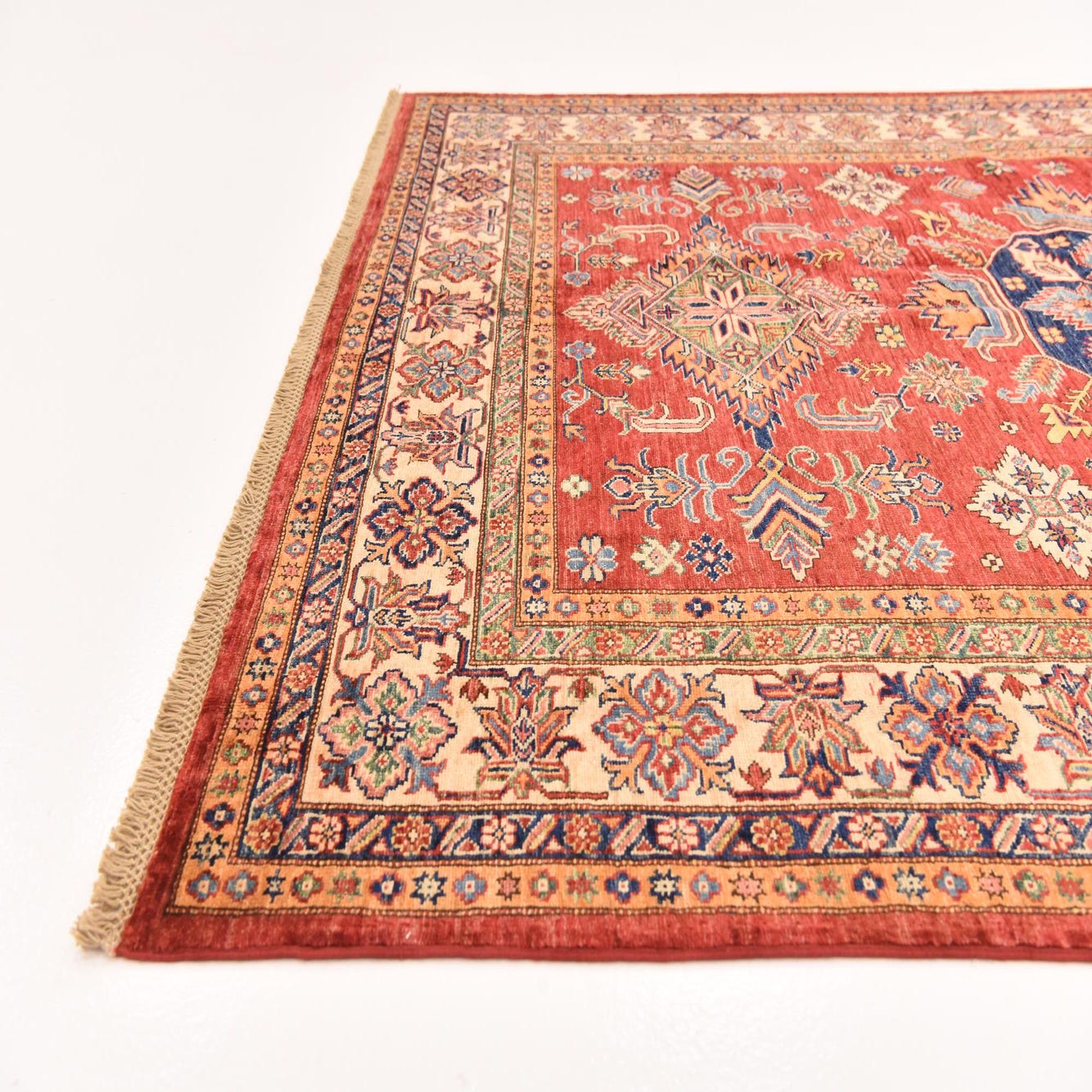 The Kazak Collection offers a 6x9 hand-knotted rug crafted from 100% hand-spun wool, featuring a rich red background that anchors the piece with a sense of warmth and vitality. The pattern is a traditional composition with geometric and stylized floral motifs that converge in a central medallion, flanked by complementary designs in black, blue, brown, cream, green, navy blue, salmon, and peach hues that enhance the overall visual interest. The intricate border, consisting of multiple layers, showcases a keen attention to detail and adds to the rug's sophisticated allure.