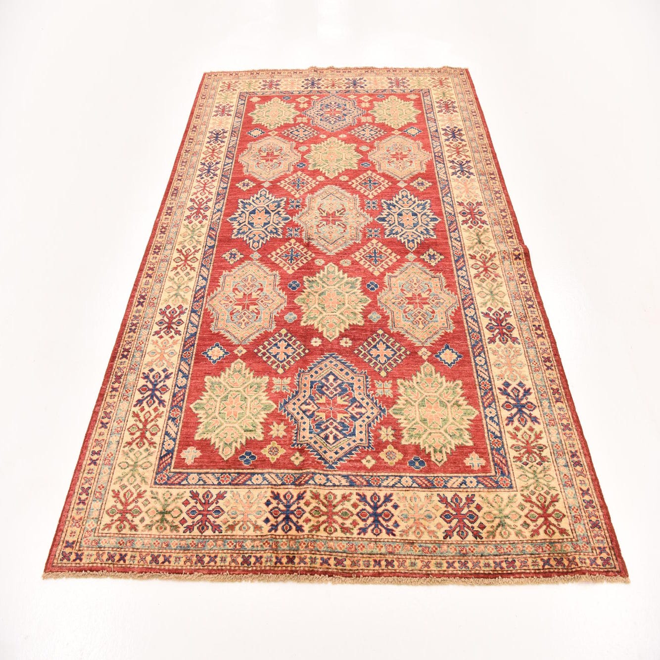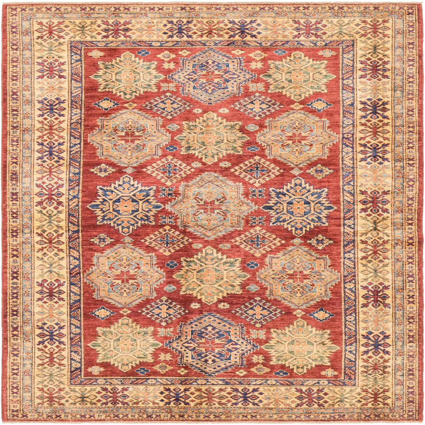A 6x9 rectangular red Kazak rug featuring traditional Southwestern and tribal patterns in blue, green, and gold.