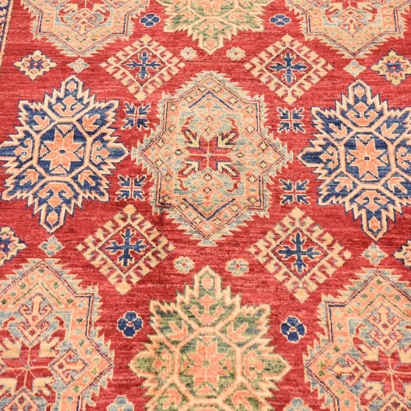 This Kazak collection rug is hand-knotted from 100% hand-spun wool, offering both durability and a luxurious feel underfoot. The rug features an intricate geometric pattern with traditional Kazak motifs, creating a rich tapestry of design. Colors in this rug encompass a palette of Red, Black, Blue, Brown, Cream, Green, Salmon, Navy Blue, and Peach, with a dominant red background that brings warmth and vibrancy to any room.
