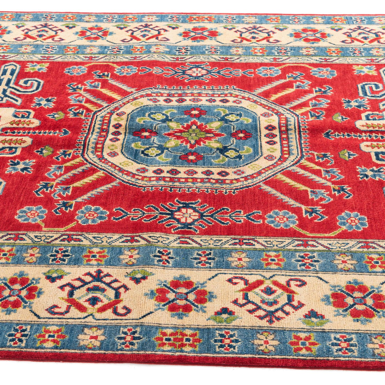 A 6x9 rectangular red Kazak rug with a central blue medallion and intricate traditional patterns in red, blue, and cream.